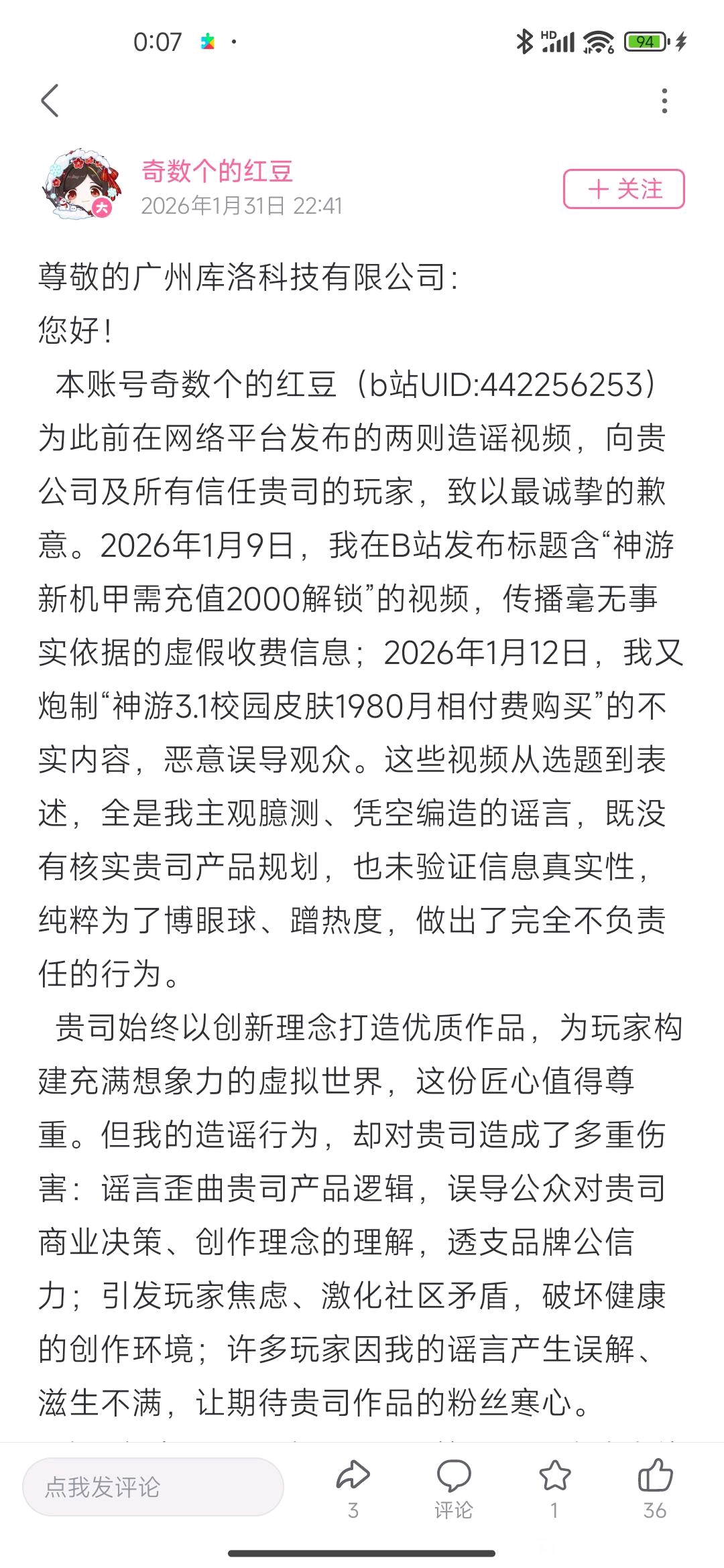 向米哈游道歉