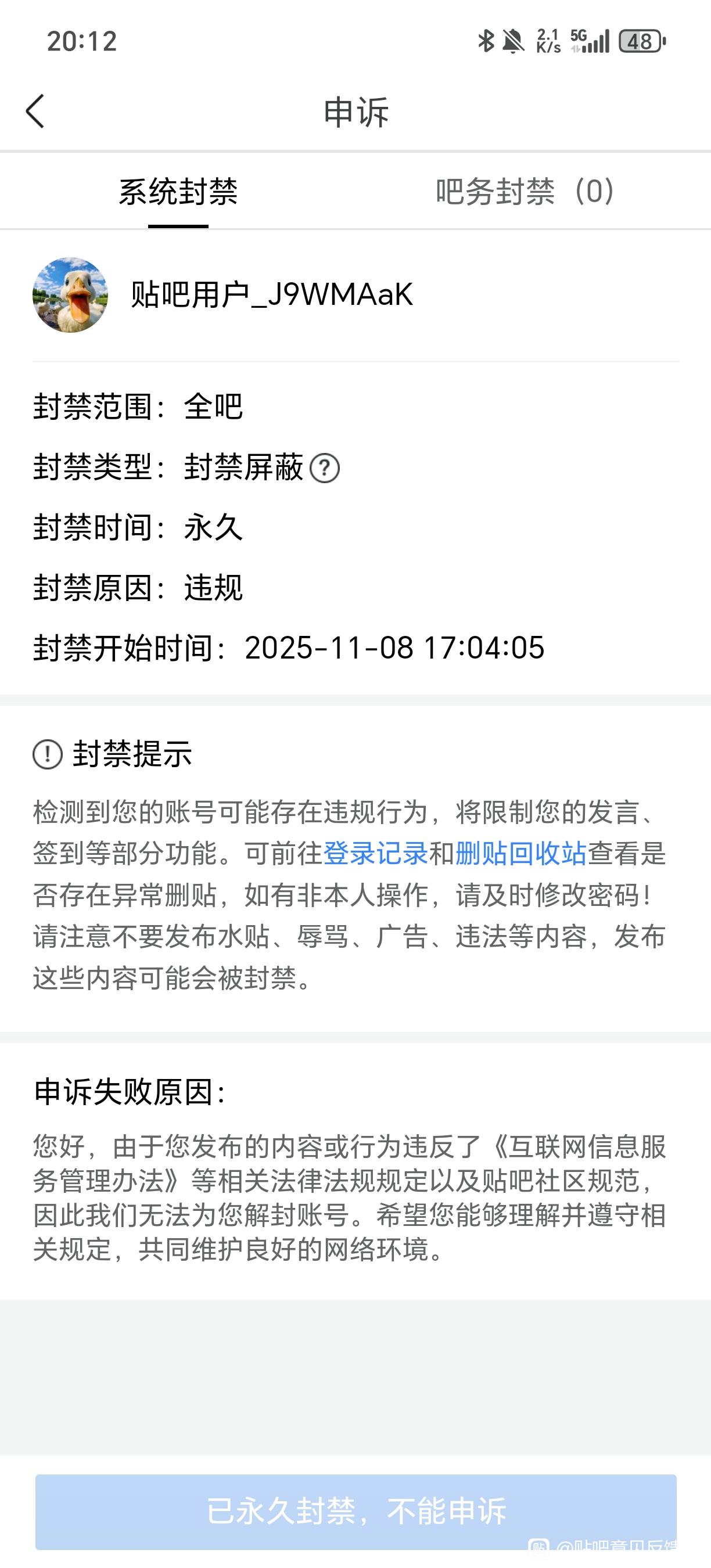 关于账号被封禁,申诉不过