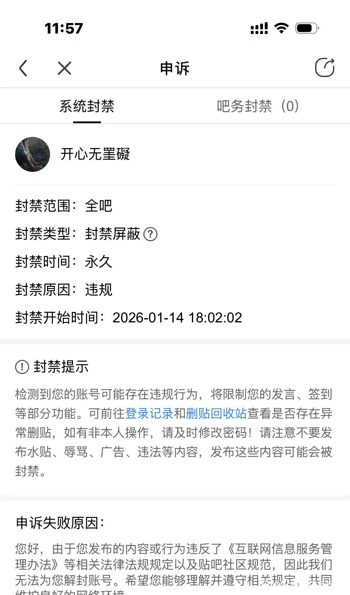 【IOS 申请解封】iphone7.3.0 贴吧账号封禁30天