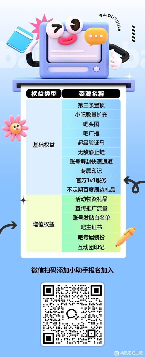 【报名方式】符合条件的吧主,扫码添加官方小助手企业微信,备注【吧主申请】,即可开启高效管理新体验