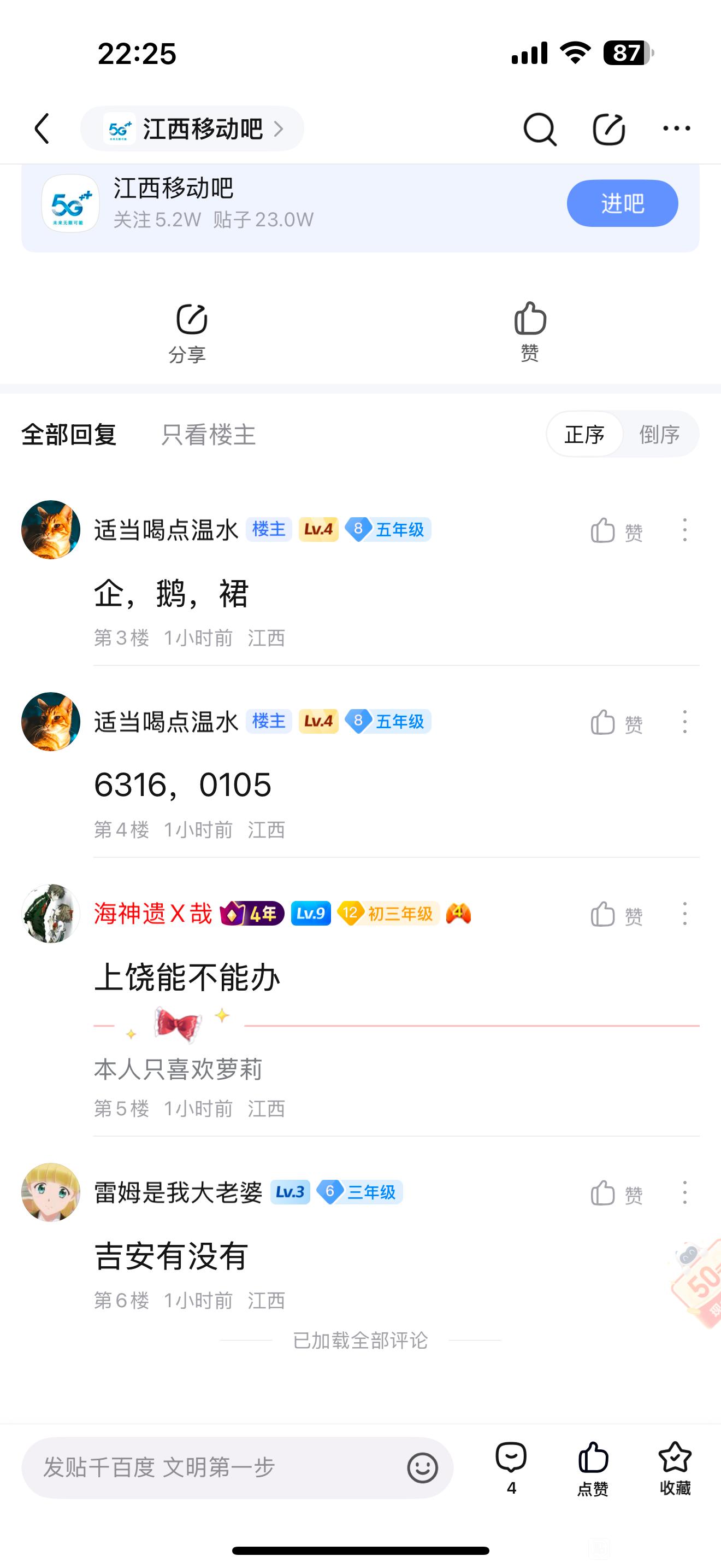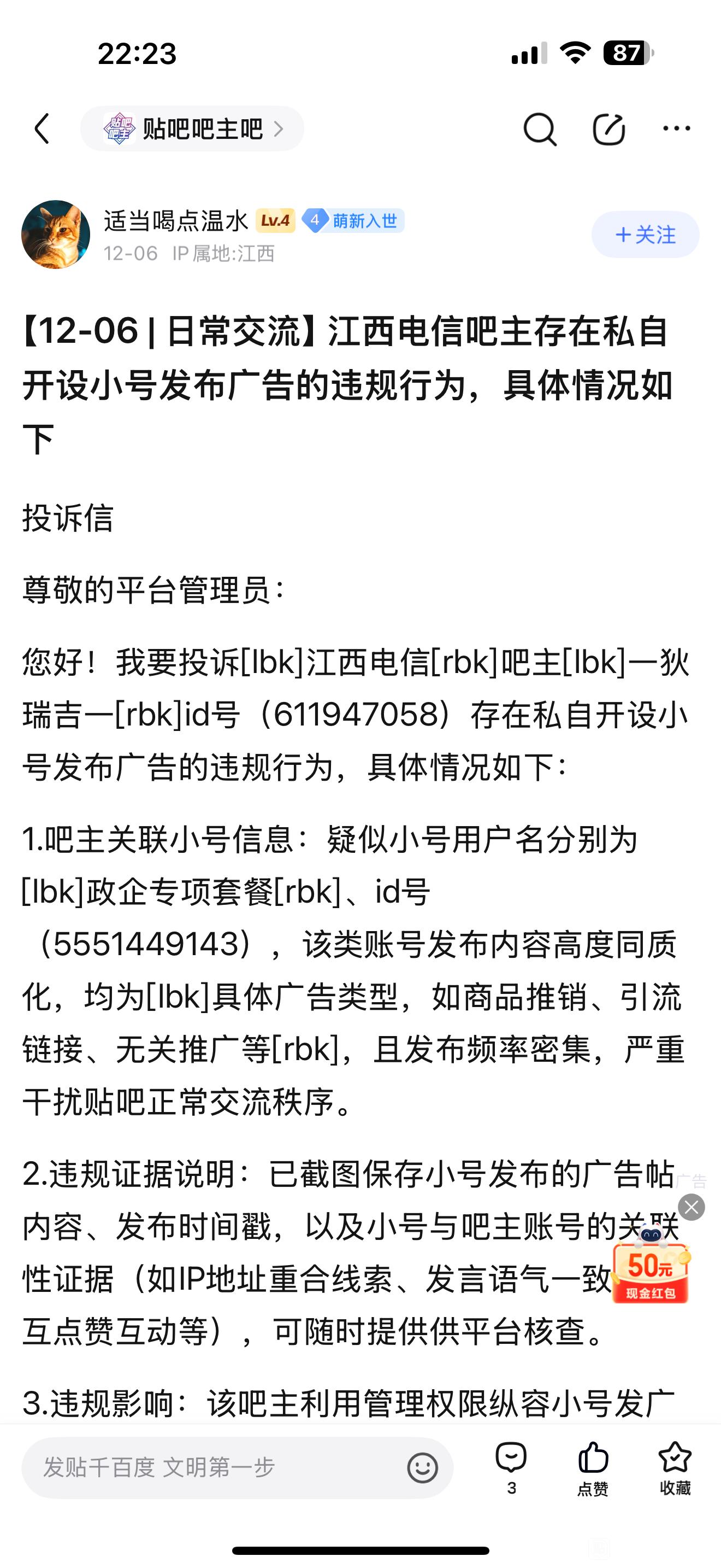 贴吧吧主吧 【12-21+|+日常交流】针对恶意举报说明tid:103228207992025/12/21 22:37:015612 0 0楼主:俄是女滴 一狄瑞吉一最后回复:从GV拆分没想到没地😲😳2026/01/12 12:24:171楼pid:1530058682642025/12/21 22:37:01俄是女滴一狄瑞吉一 楼主 9级 本人为江西联通,江西电信吧吧主,针对举报说明不存在相关事实,此人自己为广告发布者,长期破坏贴吧环境恶劣,并长期辱骂吧务,长期发布在采取封禁措施无效拉黑,现在蓄意报复造谣捏造事实。@贴吧阿Sir 以下为相关证据3楼pid:1530740292612026/01/09 12:57:15丿金蛇丶郎君13级 4楼1条pid:1530833111362026/01/12 09:09:06俄是女滴一狄瑞吉一 楼主 9级 @齐天大圣之混世魔王从GV拆分 齐天大圣之混世魔王11级 啥意思5楼pid:1530833731322026/01/12 09:33:28俄是女滴一狄瑞吉一 楼主 9级 @本人已摆,烂勿扰!!6楼pid:1530833816822026/01/12 09:36:43俄是女滴一狄瑞吉一 楼主 9级 @看淡①切