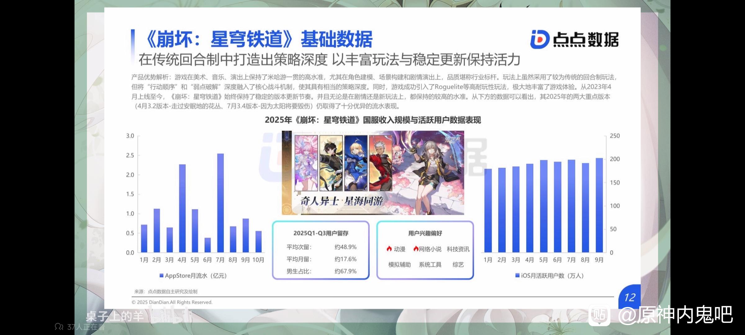 周先生1zx 小红哦回复:如果你是原神开服玩家你应该知道当时的原神和现在的差距到底有多大,就算是现在的原+铁+绝都不如当时。就是2.1-3.2左右,当时就算是淡季原的虎牙直播主播在线人数都是1500-2000个。更别说B站了。视频播放高的更是数不胜数(个人up主创作)。现在曾经的米家主播是不是到处播各种游戏,曾经的米家up主是不是已经转型做别的题材。我自己关注的好些要么打王者要么三角洲要么已经很久不播了。你说的基本盘越来越大不觉的奇怪吗。
