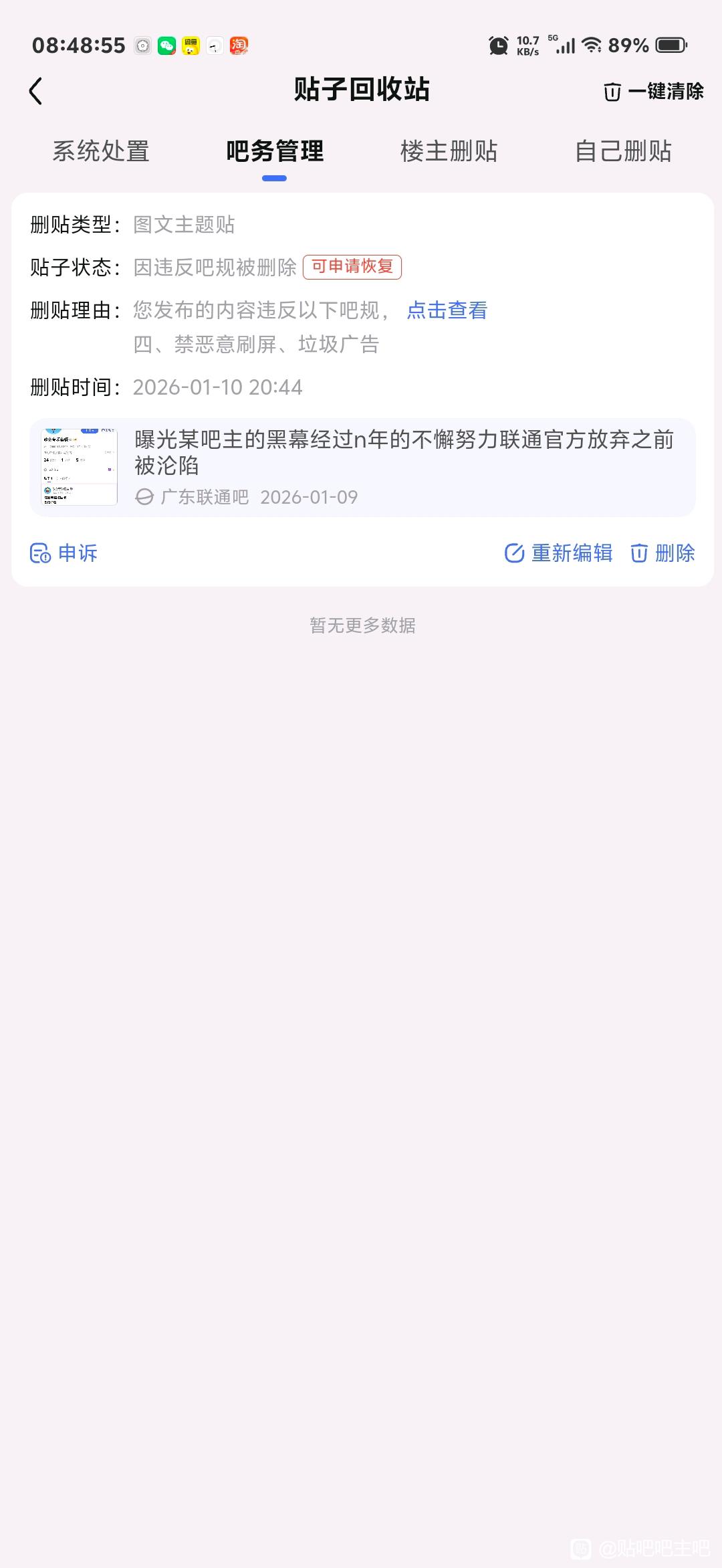 贴吧吧主吧 【01-11 | 日常交流】广东联通吧务封禁我号原因是我曝光某吧的黑吃喝tid:103859456952026/01/11 08:48:186479 1 0楼主:适当喝点温水最后回复:贴吧吧主小管家吧主12级 2026/01/14 13:35:481楼pid:1530799837882026/01/11 08:48:18适当喝点温水 楼主 5级 这公平吗2楼pid:1530799843742026/01/11 08:48:33适当喝点温水 楼主 5级 @贴吧阿Sir @寂寞江湖路 @贴吧吧主小管家3楼pid:1530799916152026/01/11 08:52:06适当喝点温水 楼主 5级 4楼1条pid:1530802661262026/01/11 10:43:56AQ锋子摆烂中。。勿扰!!8级 反对无效俄是女滴 一狄瑞吉一9级 看评论区真相适当喝点温水 楼主 5级 法律是公正的,人人平等,5楼pid:1530803423812026/01/11 11:12:36从GV拆分齐天大圣之混世魔王11级 😄俄是女滴 一狄瑞吉一9级 看评论区真相6楼pid:1530827986412026/01/12 01:53:47俄是女滴一狄瑞吉一9级 删完给你自己发吗?广告🐶7楼pid:1530909570052026/01/14 13:35:48贴吧吧主小管家吧主12级 吧友您好,关于吧主及其吧务团队违规举报请收集充分的证据至官方指定渠道——吧主投诉中心( http://tieba.baidu.com/pmc/reportBazhu )进行投诉。同时建议您严格按照以下内容提供相应的证据,有助于提高您的投诉成功率。附:吧主违规投诉方法请参考教程贴:http://tieba.baidu.com/p/6400710239
