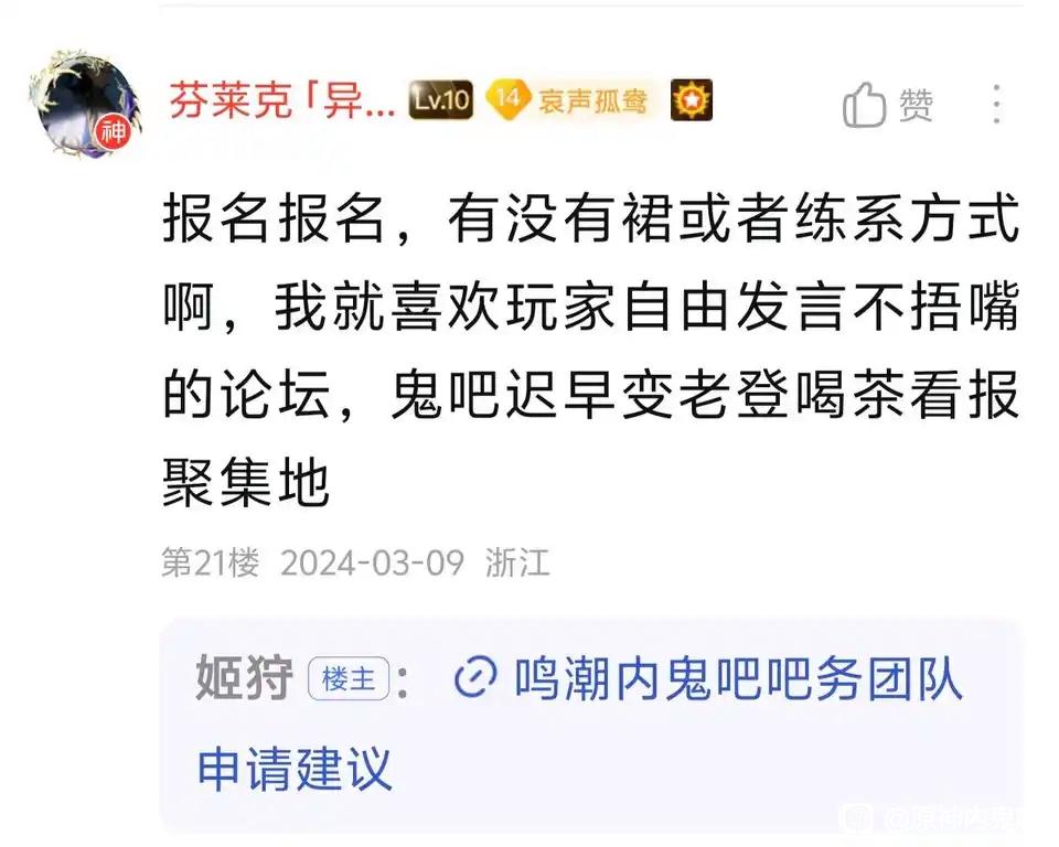 我感觉这里才是真正的鸣潮社区,自从鸣鬼吧爆炸之后鸣潮的吧没一个正常的,主吧莫名其妙删帖,暗区永远是给厂商招黑的,爆吧说话得小心翼翼的说错话就被追着咬,鸣鬼说是中立自由但是不禁新鸣鬼导致氛围偏滑,而且鸣潮做的越来越好氛围却越变越滑,感觉这群人就是米债库还的那批人,哪有游戏是完美找不出毛病的,平时抓着鸣潮的小问题骂就算了连爱弥斯都能骂,还是原鬼更好,想孝就孝想滑就滑不会被捂嘴,库洛做得好我就护着,做的不好我就骂