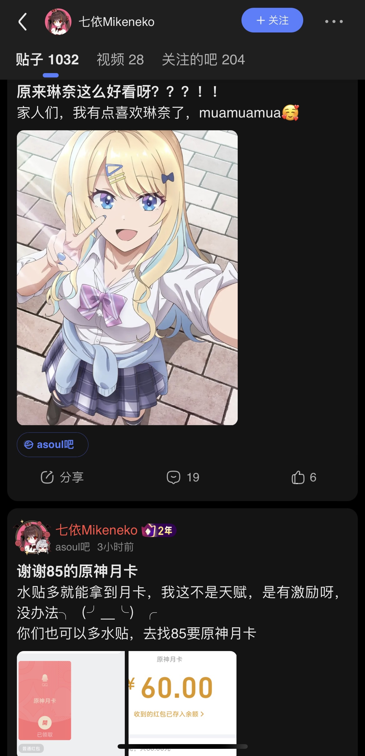 还有两张月卡,15号开奖。我总共才抽了六张,以后乃琳破五万同接就再开抽奖帖吧,起码再抽四张,凑个整数