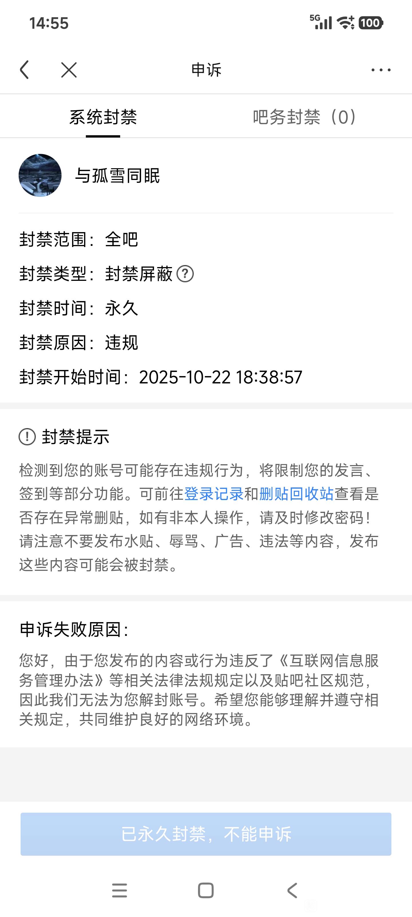 贴吧意见反馈吧 申请解封账号tid:103995925732026/01/15 17:36:024239 3 0楼主:落🍀时节Lucky最后回复:7Ji大狂风贴吧用户_QD82aKt2026/01/17 12:22:041楼pid:1530951966512026/01/15 17:36:02落🍀时节Lucky 楼主 6级 尊敬的度娘:您好!我的账号“萌的眼神”被永久封禁,得知结果后我反复回想自己账号的情况:当时我的号之前被人盗了很长一段时间,现在想重新看贴吧才找回来,如果这个号发布了违规信息,也都是盗我号的人发布的,我是真不知道有没有发布、具体发布了啥内容并且这些和我也没啥关系,我只想偶尔看贴子回贴子。若能有幸获得解封机会,我必抱着真心悔改的理念绝不会再疏忽大意,保证会严格重视账号安全防止被盗,并且必定以最严格的标准约束自己。恳请您能念在我真心悔改的份上,给我一次机会好吗?2楼pid:1530952001182026/01/15 17:37:15落🍀时节Lucky 楼主 6级 恳请解封账号“萌的眼神”@贴吧阿Sir @贴吧Madam3楼pid:1530980769302026/01/16 14:14:33落🍀时节Lucky 楼主 6级 @贴吧阿Sir @贴吧Madam4楼pid:1530989728482026/01/16 19:11:23行路者818残岛日j15级 申诉啊~5楼pid:1531011489992026/01/17 12:22:047Ji大狂风老豆的父亲1级 你还在坚持啊,我和你基本同一时间被封永久的,18:35封的,现在还没解,不过我还有两次申诉机会但是都没用