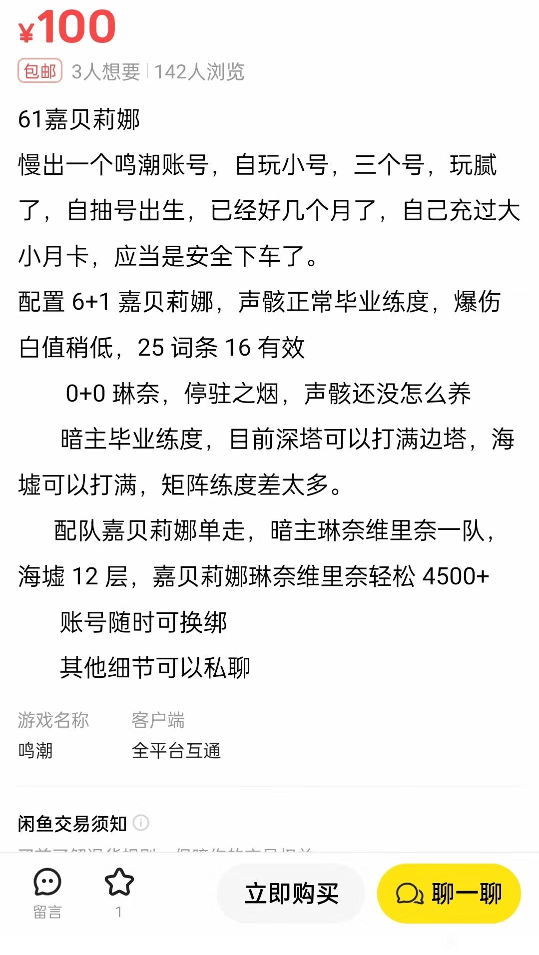 20楼pid:1530969406412026/01/16 07:23:12华y年3级 不懂100性价比相对自抽咋样,总之这号看着是挺牢的,单6链没什么用,没多少地方需要6链,需要的地方这就一个嘉,队伍少也不够用。没仇远,看着像是前号主嘉贝池子买的自抽,抽完中间没玩,琳奈池子想起这个号领邮件抽了一下就给卖了,找人接盘来了。不如找个纯的自抽号。喜欢嘉贝的话,二命带专就够了,机制完整数值也不错,另外老库挺可能春节开放多个池子的吧,嘉贝卡池应该不远。