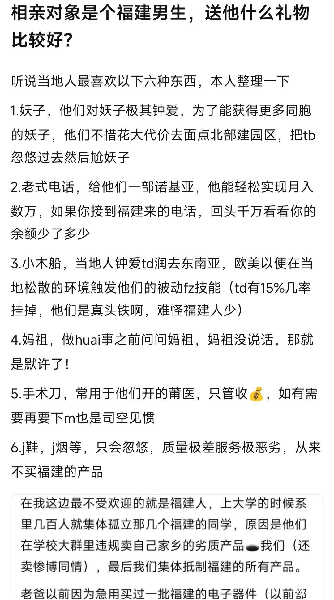 严重怀疑福建当地的家长教育孩子从小就从事闸片等黑灰产业,当地作为没有任何zc加持还能成为近三十年发展最快的地方,那些老板做的买卖基本就没有合f的。也早有博主爆料过大量在东南亚等地的园区老板,无一例外全是福建人。之前认识的几个福建同学对他们老家的这些闸片,莆医,福清帮等产业感到无比自豪和崇拜,没有任何fl意识,觉得就算进去几年也完全不在乎,导致后来我们一律不买任何福建的东西