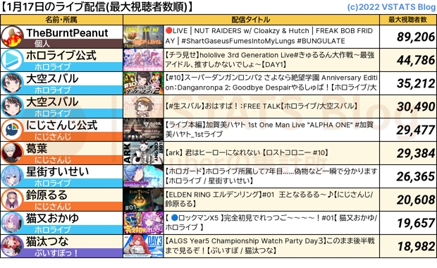 1万以上枠数】29枠個人(TheBurntPeanut, 結城さくな)ホロ17枠(ホロライブ公式, 大空スバル, 大空スバル, 星街すいせい, 猫又おかゆ, 獅白ぼたん, 白上フブキ, 博衣こより, 響咲リオナ, 風真いろは, 綺々羅々ヴィヴィ, 角巻わため, 森カリオペ, 古石ビジュー, 博衣こより, 綺々羅々ヴィヴィ, 音乃瀬奏)にじ5枠(にじさんじ公式, 葛葉, 鈴原るる, 鈴原るる, 狂蘭 メロコ)BraveGroup5枠(猫汰つな, Neo-Porte公式, 猫汰つな, 龍巻ちせ, 神成きゅぴ)