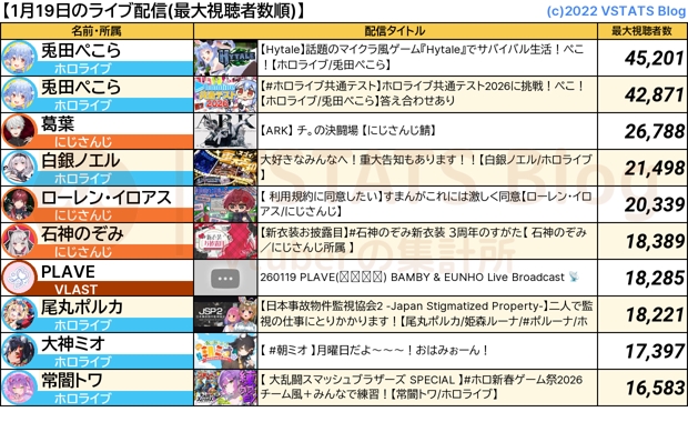 vtuber吧 2026.1.19tid:104123135082026/01/19 23:08:132379 0 0楼主:泽塔kiss 莉·泽塔😺kiss小吧15级 最后回复:Sssakuramiko2026/01/19 23:34:161楼pid:1531098592772026/01/19 23:08:13泽塔kiss莉·泽塔😺kiss 楼主 小吧15级 【1万以上枠数】19枠ホロ9枠(兎田ぺこら, 兎田ぺこら, 白銀ノエル, 尾丸ポルカ, 大神ミオ, 常闇トワ, 綺々羅々ヴィヴィ, IRyS, 白上フブキ)にじ8枠(葛葉, ローレン・イロアス, 石神のぞみ, 加賀美ハヤト, 星川サラ, 葛葉, エクス・アルビオ, アンジュ・カトリーナ)VLAST1枠(PLAVE)BraveGroup1枠(千燈ゆうひ)2楼pid:1531099298662026/01/19 23:32:28SWhiteCheng東南海島見證奇兵10级 明天35就回来了,兔子的好日子到头啦3楼pid:1531099350562026/01/19 23:34:16Sssakuramiko11级 明天好日子就到头咯