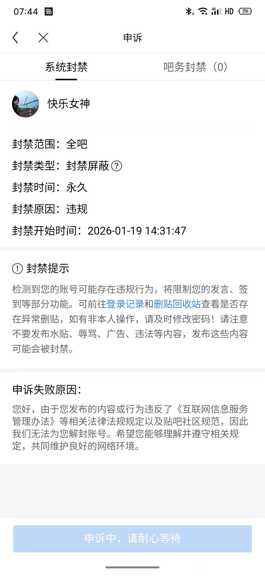各位贴吧管理员,你们好!我是一个热爱贴吧的用户,我在贴吧里发表了很多帖子和评论,也收获了很多朋友和乐趣。但是,昨天一觉醒来,发现我的账号被封了,原因是"违反《互联网信息服务管理办法》及贴吧社区规范"我很诧异,因为我从来没有故意违反过任何法律法规,我也尊重贴吧的规则和秩序。我立刻去查看了《互联网信息服务管理办法》,仔细学习了其中的条款,发现我没有做过任何违反该法律的事情。我认为这是系统的误判,可能是因为我发的某些内容被误认为是有害的。对于失败的原因,那里写到"及"贴吧社区规范,我认为应该改为"或",因为我承认我可能不小心违反了贴吧的一些规定,因为贴吧的规定太多了,我作为一名普通的用户不可能都记住。我对此表示歉意,我以后会注意自己的言行,遵守贴吧的规范。我希望贴吧的管理员能够给我一个公正的处理,解除我的封号,让我重新回到贴吧的大家庭。我也希望贴吧的系统能够完善自己的判断机制,避免对无辜的用户造成不必要的困扰。谢谢你们的理解和支持!申诉账号:xuanchengweng