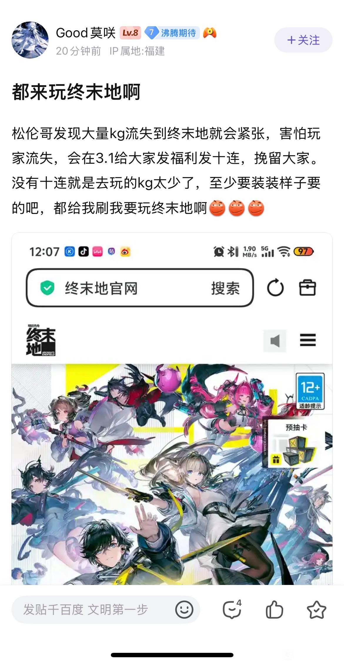 理论泼墨 Good莫咲松伦哥发现大量kg流失到终末地就会紧张,害怕玩家流失,会在3.1给大家发福利发十连,挽留大家。没有十连就是去玩的kg太少了,至少要装装样子要的吧,都给我刷我要玩终末地啊