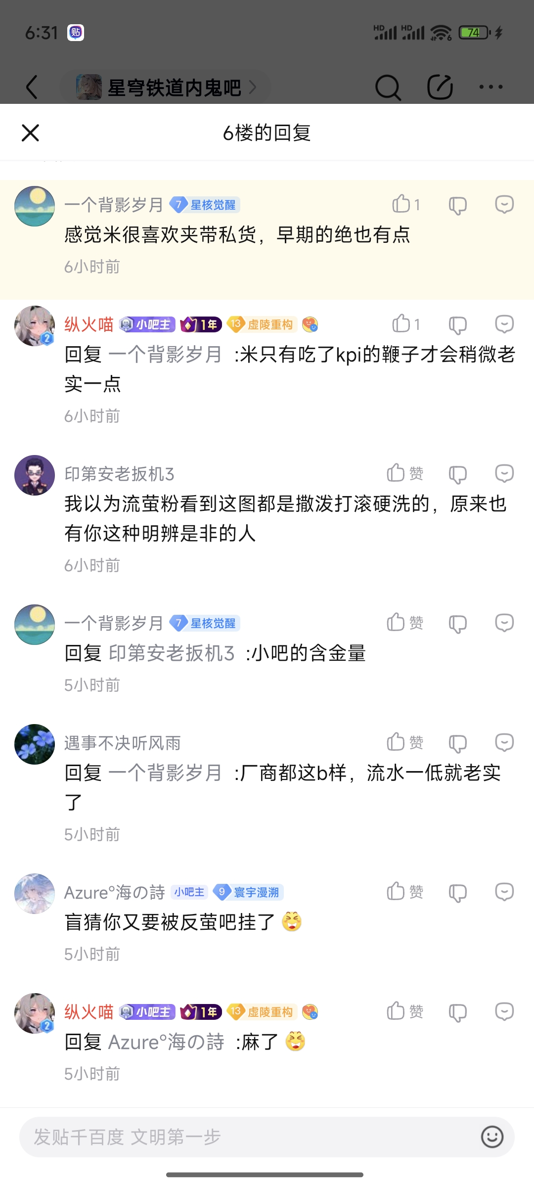 这就是连爆料吧都不发贴的社区优质鸣潮玩家啊,深塔海墟是一点不打的,库叠发的图是要狠狠捂嘴的🤣🤣🤣争议是装作看不见的,呲个淋畜的黑称给你能的啊,全家得4期肿瘤包庇的玩意