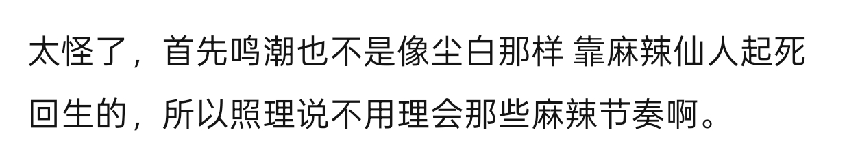 太怪了,首先鸣潮也不是像尘白那样 靠麻辣仙人起死回生的,所以照理说不用理会那些麻辣节奏啊。