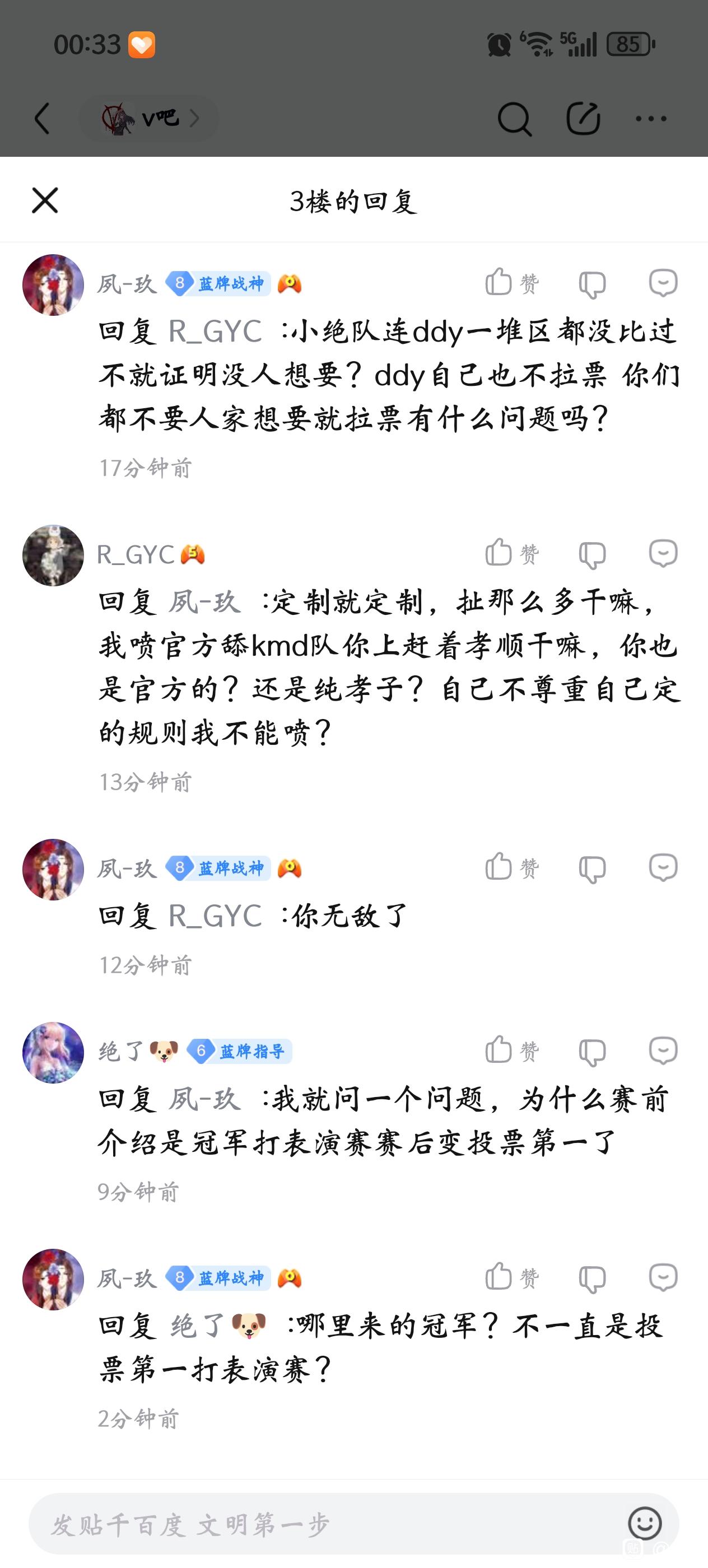 R_GYC回复:看不懂人话?最开始不是投票第一打表演赛,谁赢谁拿钱,为啥改成投票直接拿钱?kmd没号召力,他们队不是一堆百大拉票吗,能拉票不能打比赛是吧,闹麻。我说官方孝顺kmd队,我说他急着要钱了吗,你上赶着孝顺干嘛