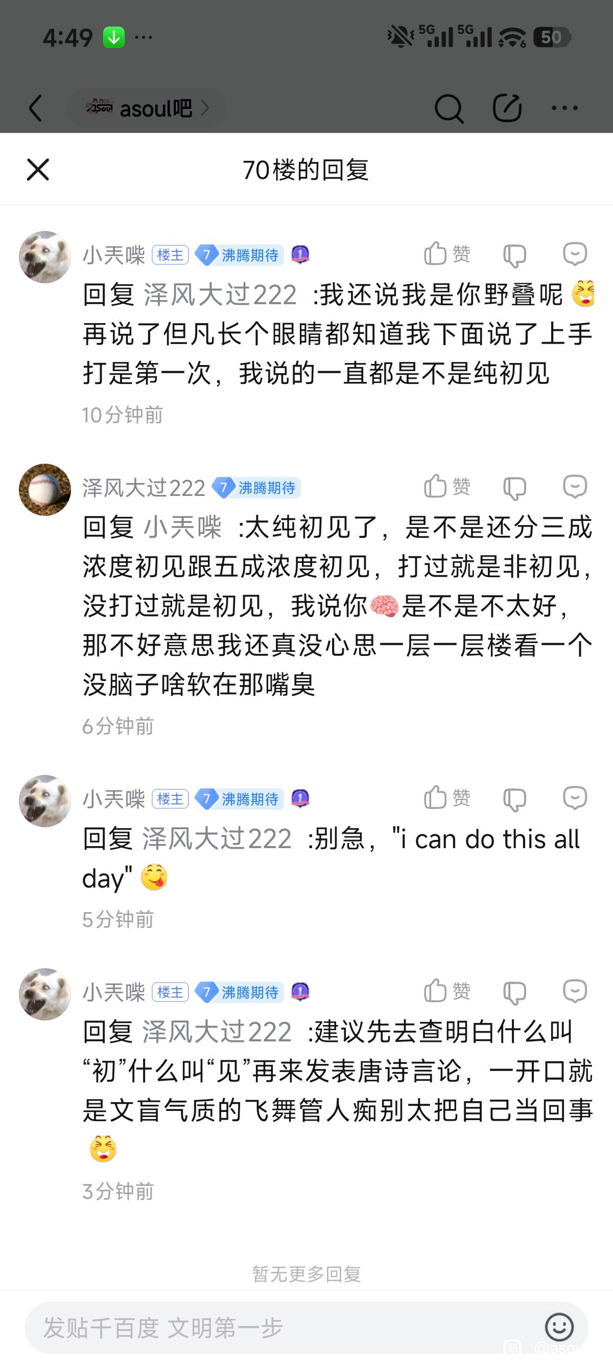 起始页asoul吧 遛一条✓,你真有种就把我解除拉黑tid:104160265372026/01/21 04:52:167367 1 0楼主:泽风大过222最后回复:四时风雨syf四十风衣💤2026/01/21 05:45:431楼pid:1531138485062026/01/21 04:52:16泽风大过222 楼主 7级 而不是一边说我急了一边把我拉黑然后一通辩来精神胜利2楼pid:1531138539062026/01/21 05:01:14夏娜好萌啊然然😢我的然然9级 @小兲喍3楼2条pid:1531138630622026/01/21 05:16:15少年学飞琳贝8级 确实有点抽象,前垫步有0.3秒无敌帧,其他方向有一般0.2秒,然姨玩游戏一般都是见招拆招的打法,发现垫步并不奇怪,而且知道垫步可以卡0.3内的招式能用就用,不行换成其他方式继续拼刀也行,垫步也只是一个基本操作,跟初见boss有啥关系,然姨不会驼子还不会吗,只要告诉然姨基本操作就行,剩下怎么打不都是看然姨自己怎么打,哪个攻略是纯靠拼刀打过去的,哪个攻略是靠龟缩大法打心宜的泽风大过222 楼主 7级 我主要觉得逐帧分析鉴是否初见太老缠了,让我想起来隔壁逐帧分析鉴ai的一群老缠少年学飞 琳贝 层主 8级 回复 泽风大过222 :感觉他就是想带节奏的,问就是劝粉丝不要造神,但是正主都说初见了,又让人看其他评论,有那么多人说是初见他当看不见的,总之就是质疑4楼pid:1531138670212026/01/21 05:22:44少年学飞琳贝8级 而且然姨打游戏基本不锁定的5楼1条pid:1531138809552026/01/21 05:45:43四时风雨syf四十💤11级 这人的逻辑太脑残了,凡是不符合自己认知的就是假的,只能说顺从泽风大过222 楼主 7级 挺羡慕这种人精神状态的,跟个啥暖一样谁反驳我我就喷谁就行了,起码不容易内耗6楼1条pid:1531139844022026/01/21 07:35:31a919182064阿库娅🤤6级 @小兲喍 唐b魂孝子进来玩a919182064 阿库娅🤤 层主 6级 @小兲喍
