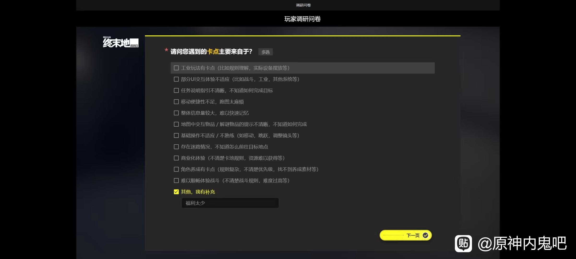 原神内鬼吧 上来就发调查问卷?老🦅有点急啊tid:104201044122026/01/22 13:22:494602 2 0楼主:庄方宜的主人最后回复:贴吧用户_J6KWaD62026/01/22 14:21:241楼pid:1531181873162026/01/22 13:22:49庄方宜的主人 楼主 7级 麻烦的大家都填一下福利太少,谢谢2楼pid:1531182235272026/01/22 13:35:33yiyeabc007贴吧用户_Gy6yDEP1级 答半天给了300英镑,这福利真是闹麻了。3楼pid:1531182709202026/01/22 13:52:27草莓圣代咖啡阿米酱😘9级 一抽都没有,300英镑打发谁呢4楼pid:1531183176262026/01/22 14:08:15Ngcsdxbbqxxx7级 不要当负资产6楼pid:1531183564132026/01/22 14:21:24庄方宜的主人 楼主 7级 闹麻了,升一级给50英镑
