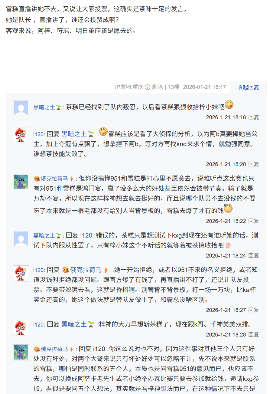 所以说了她直播说这个架队友怎么了?xqq是想在v吧也控评吗?951还真是被她架住了,不想打叫过来;雪糕自己觉得和主办爆了下不了台,951也只能跟着不打。怎么?你们不是最爱炒茶糕的布局吗?炒一下雪糕直播妙语拿捏四队友啊,是觉得一炒就真炒大了吧?无脑护主不要怪人加速。- 回复:【不打了退赛】、【我硬完了,我不打了】、【开心果不差钱】这三句话是雪糕在20号下午直播时说的,雪糕自己说的当时投票还没有结果。别的不说了,如果说她是霸总你会破防,那我觉得说对了。