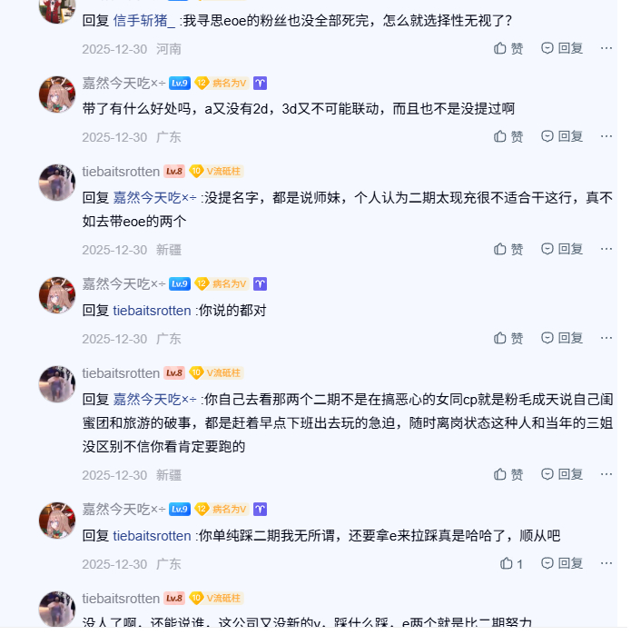 串子死亡冲锋骂运营要带一句运营偏向柚恩,柚恩玩2077出头了粉丝也要踩露早萌妹玩游戏,玩原神拉了又开始“还是露早比较明智,比柚恩聪明太多”。我说eoe粉丝能不能自己先营造点团魂再来扯有的没的。