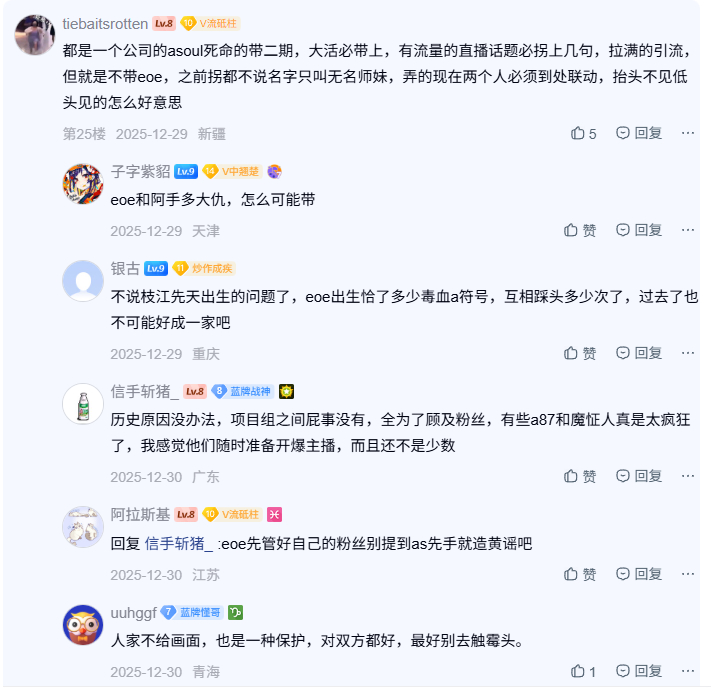 拉群蛐蛐算上古事迹就不提了,现在eoe就俩人了,两边粉丝照样扯花头。俩人单播一千多同接,双播居然有接近三千同接,感情那两三百团推都跑v吧发帖来了。