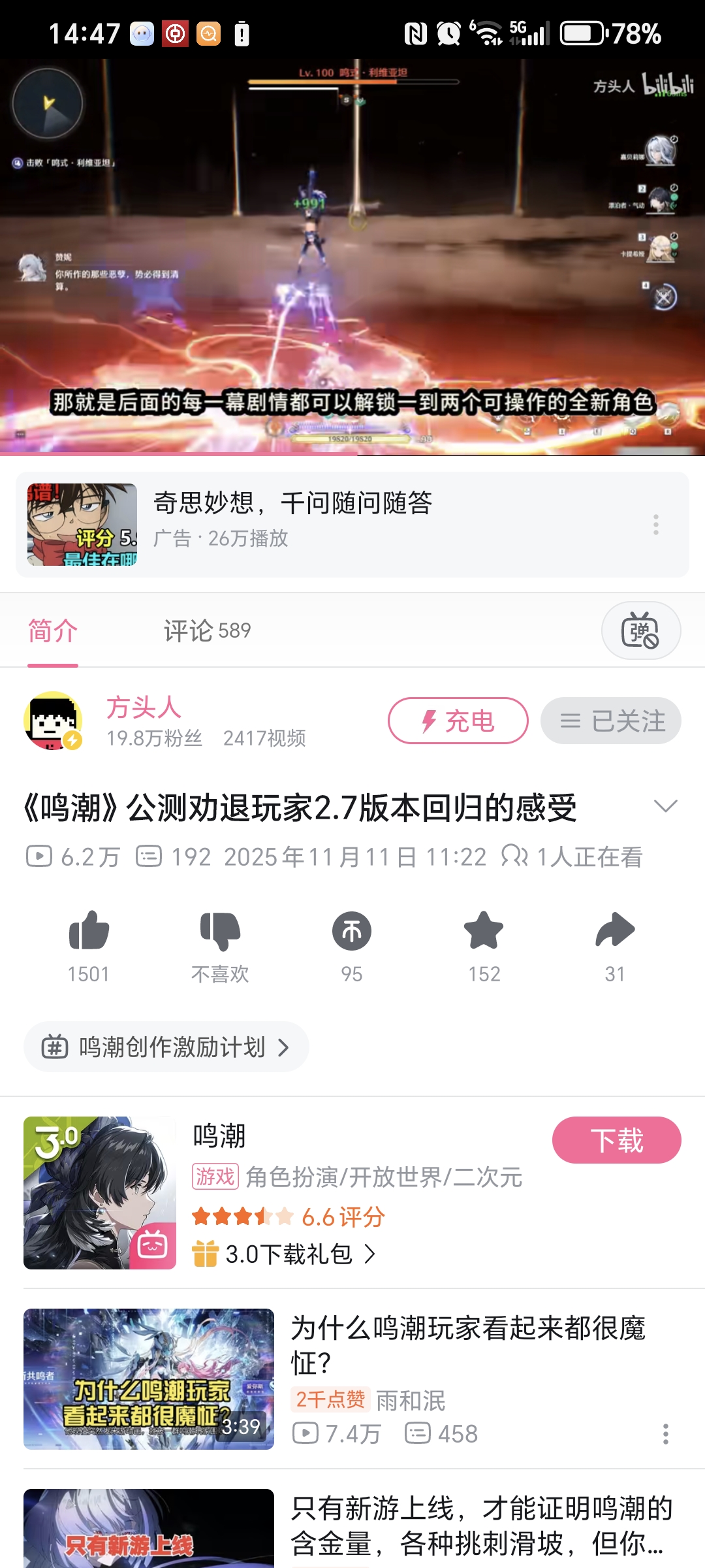 当时逛b站想正常看个鸣潮视频都看不到,全是节奏,但我自己玩时其实挺爽的,跑图和探索都比原感觉爽很多,战斗也爽,剧情演出也爽。不过我是pc端玩可能没受什么优化困扰,,,👀,,后面真的是产能猛猛爆,新地图新角色新玩法,2.0的飞翔和地图也是,视频也逐渐正常多了,鸣潮确实是靠质量逐渐完成翻身的