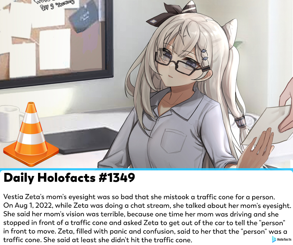Vestia Zeta的妈妈视力很差,甚至把交通锥错认成了人。2022年8月1日,Zeta在直播聊天时谈到了她妈妈的视力问题。她说妈妈的视力很差,因为有一次妈妈开车时,停在一个交通锥前,让Zeta下车去告诉前面的“人”让路。泽塔当时又惊又懵,告诉妈妈那个“人”其实是交通锥。她说,至少她没撞到交通锥。