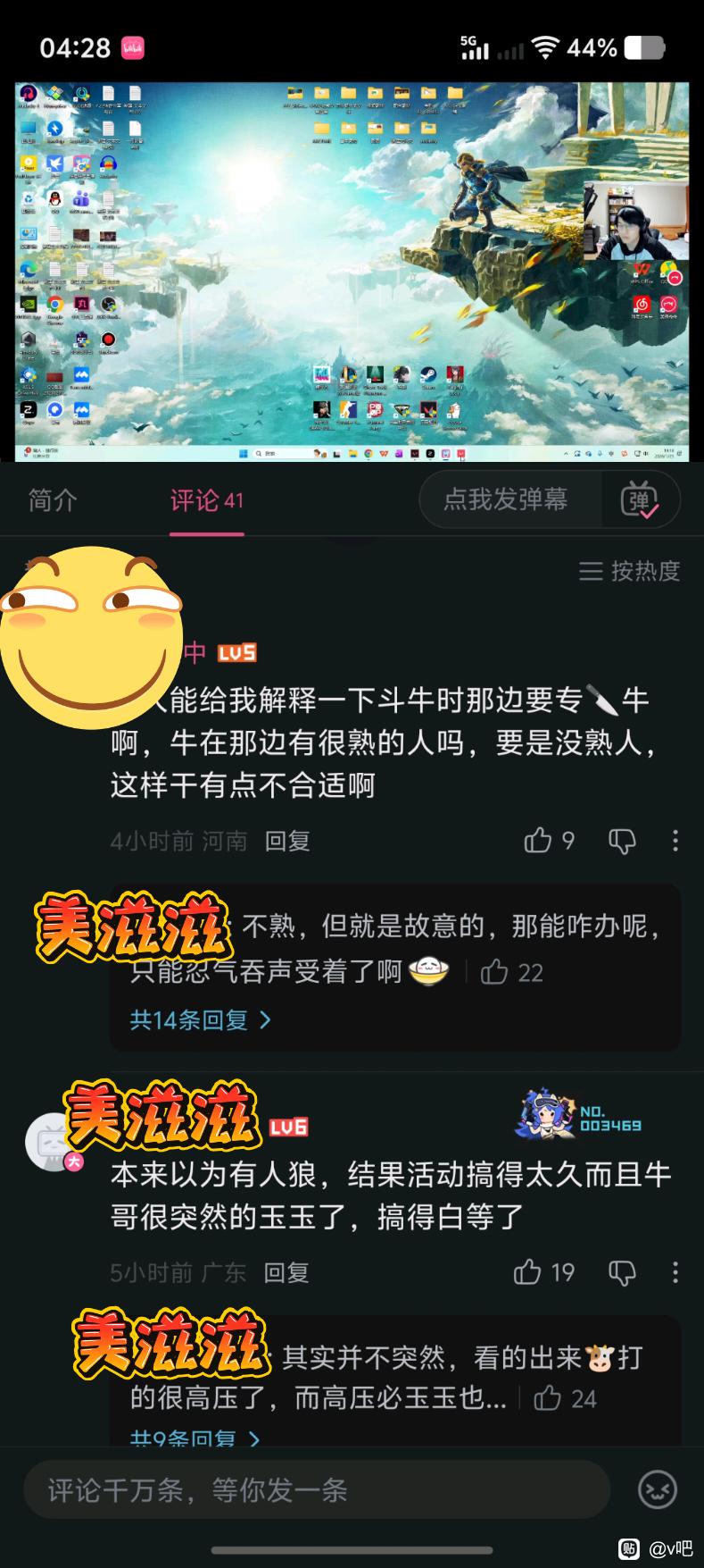 流失的记忆海回复: 这把nzh上场我在牛的视角看,看到第一次的时候感觉还行,但是后面不同的人轮流来刀我都不发弹幕了,冒汗。不管健脑片本意是什么,连续多次被刀好像在被当玩具牛多少也会红和不爽毕竟完全不熟。 如果牛今晚下播前有随口说一句“刚才被刀有点难受”啧啧我不敢想了,只能说牛虽然时不时也发脾气,今天确实也没有把脾气发泄在这上面,玉玉更多是和前几天的事有关。