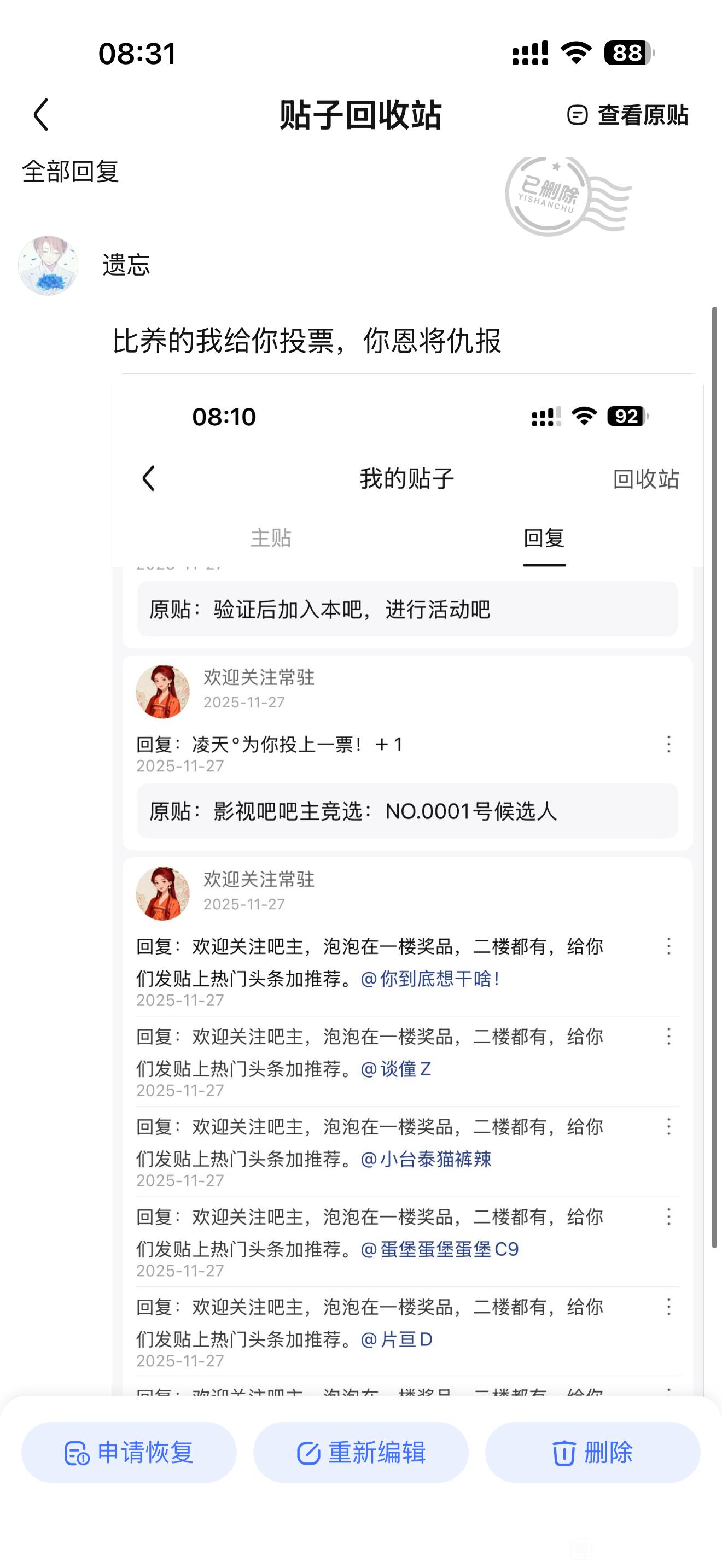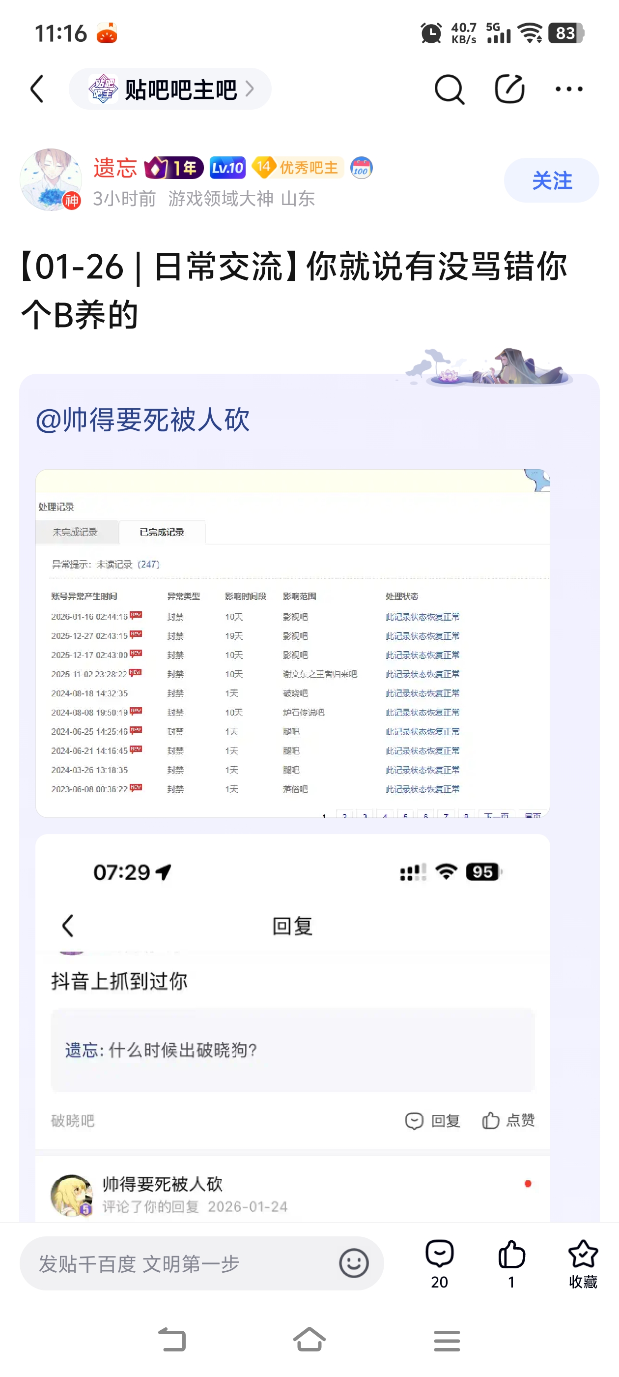 贴吧吧主吧 【01-26 | 日常交流】你就说有没骂错你个B养的tid:104309789402026/01/26 07:31:0721312 3 0楼主:贴吧遗忘 遗忘最后回复:丿金蛇丶郎君2026/01/26 11:26:571楼pid:1531306214002026/01/26 07:31:07贴吧遗忘遗忘 楼主 14级 @帅得要死被人砍 2楼1条pid:1531306243212026/01/26 07:33:08贴吧遗忘遗忘 楼主 14级 本来骂骂你算了 今天上贴吧又看到你这的信息还敢反驳帅得要死被人砍10级 那昨了?3楼2条pid:1531306596952026/01/26 07:55:45丿金蛇丶郎君13级 南征北战 不服就干贴吧遗忘 遗忘 楼主 14级 我小号给这个碧阳的还投票了丿金蛇丶郎君 层主 13级 回复 遗忘 :难道是忘恩负义之徒?4楼pid:1531306877122026/01/26 08:11:21贴吧遗忘遗忘 楼主 14级 比养的我给你投票,你恩将仇报5楼pid:1531307311582026/01/26 08:32:03贴吧遗忘遗忘 楼主 14级 6楼pid:1531307372012026/01/26 08:34:43忟尽管呼吸着同一天空的气息却无法拥抱到你了14级 7楼pid:1531307619302026/01/26 08:45:12玉本温凉16级 8楼pid:1531307854822026/01/26 08:54:56取名真是难_取名真是难14级 9楼pid:1531307992432026/01/26 09:00:34箱龟部落13级 10楼pid:1531309320182026/01/26 09:51:22吾乃追梦的滑稽煋族滑稽12级 票白投了11楼3条pid:1531309487092026/01/26 09:57:18阿什拉2008(งᵒ̌﹏ᵒ̌)ง7级 影视吧全吧都是广告贴,那些发资源的都是拉人赚人头费的,别人使用它的链接点进去有转存就赚钱这几把影视吧主还给人互动,又是加精又是点赞的……不懂运营不懂套路,纯占吧给广告党当工具人多少沾点儿阿什拉2008 (งᵒ̌﹏ᵒ̌)ง 层主 7级 如果懂套路还互动,那更睿智。吧主不参与顶多管理不当,参与了互动就是纵容并参与商业行为了帅得要死被人砍10级 回复 (งᵒ̌﹏ᵒ̌)ง :�) :你说网盘有没有资源,我收钱了吗?我不发网盘,难道我直接发电影视频吗?我主页有1000多个视频,上传失败500多个12楼pid:1531309904252026/01/26 10:12:19帅得要死被人砍10级 好13楼1条pid:1531310116582026/01/26 10:19:59帅得要死被人砍10级 封你了,然后呢?丿金蛇丶郎君13级 霸气侧漏啊。14楼pid:1531311614632026/01/26 11:11:07宁宁爱吃鸡蛋卷.绫地宁宁11级 15楼pid:1531311618142026/01/26 11:11:14破灭残风13级 遗忘神速速回归群里16楼1条pid:1531311817772026/01/26 11:17:53帅得要死被人砍10级 封你的人还挺多,要不把全部吧主都拉过来,挨个骂一遍帅得要死被人砍 层主 10级 这样省事17楼pid:1531312094882026/01/26 11:26:57丿金蛇丶郎君13级 遗神速速回归群里