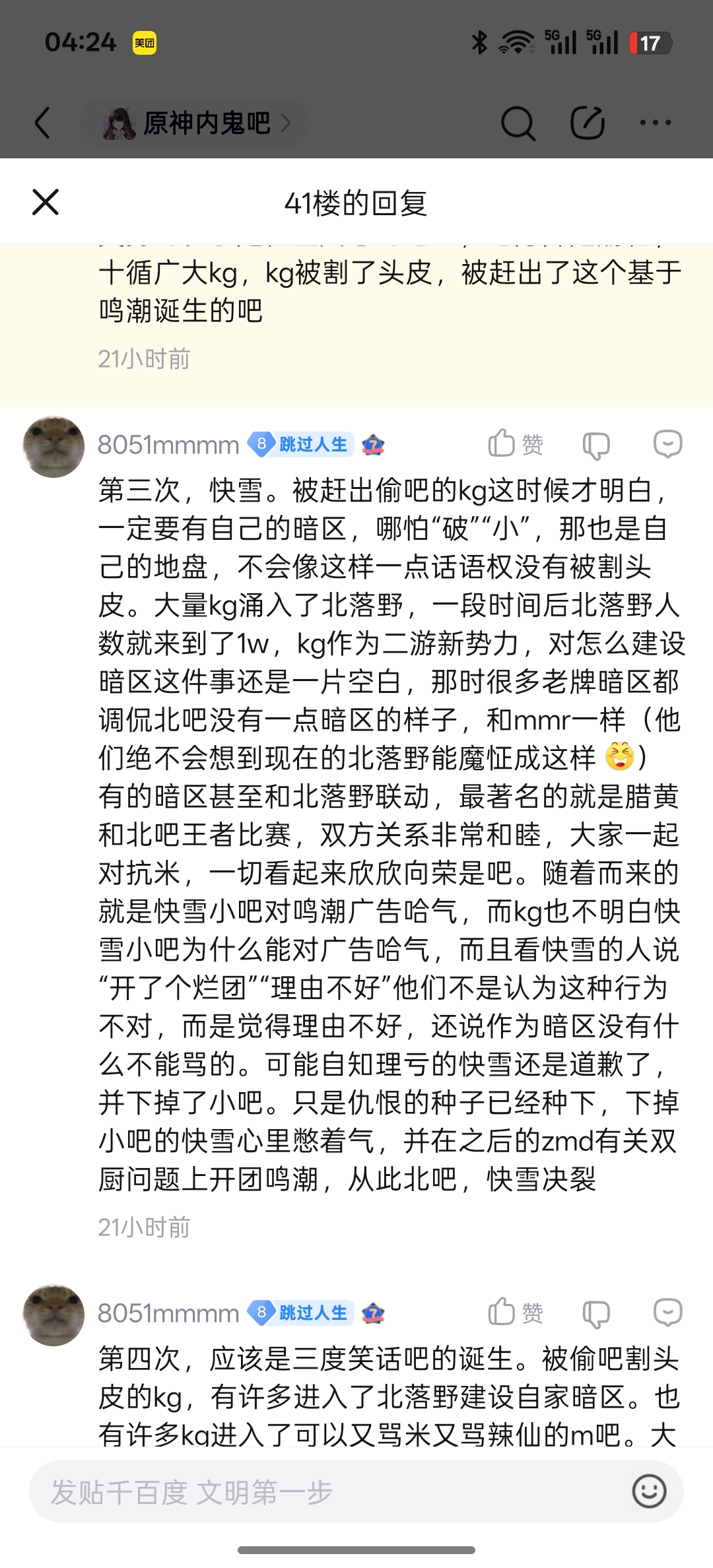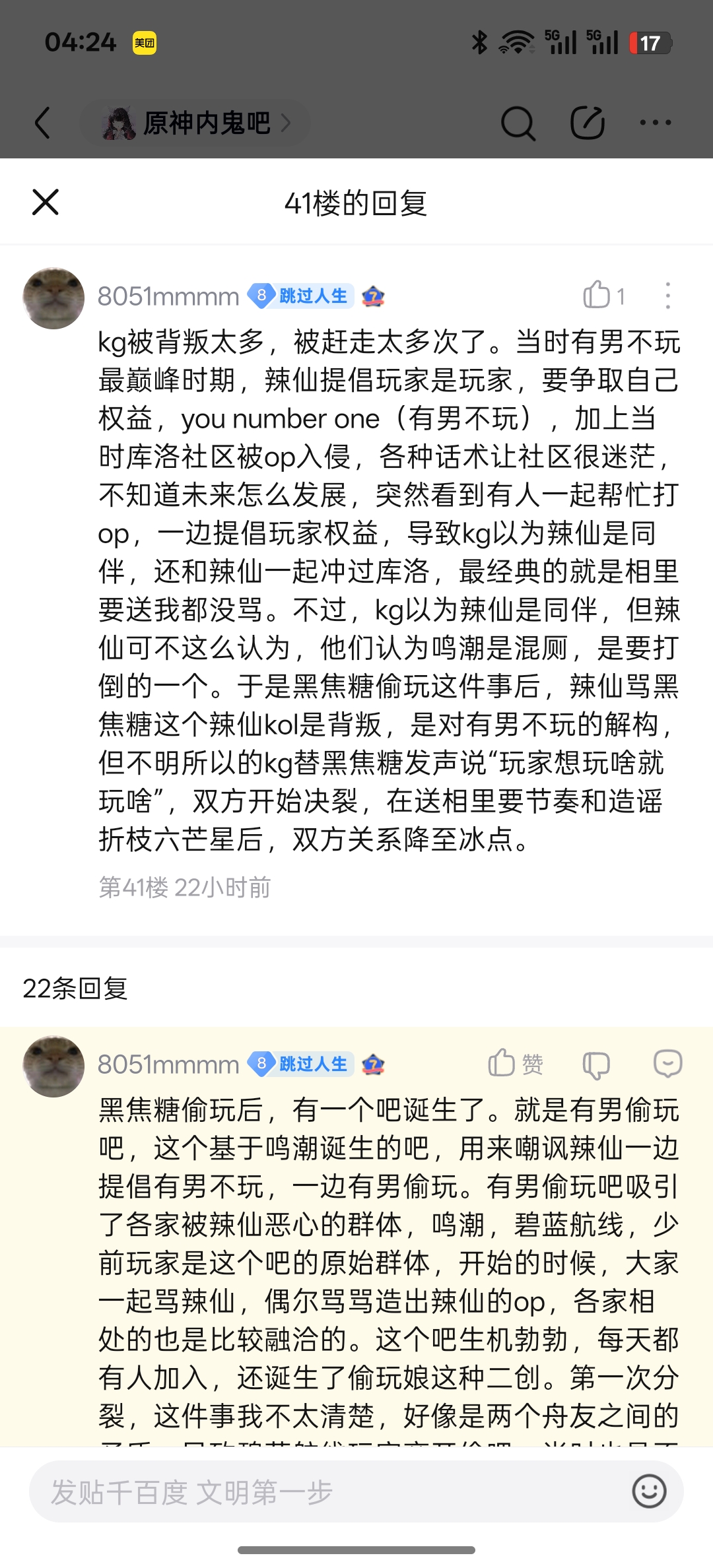 总结下来本质原因其实很简单,就是鸣开服没有基本盘,只能背靠粥和辣成分比较多,也就是反米的吧,但人家纯把鸣当工具用,于是kg痛定思痛,建立了自己的暗区北洛野吧。但由于历史遗留问题,拿鸣当工具用的这些人,也建立了新鸣潮内鬼吧