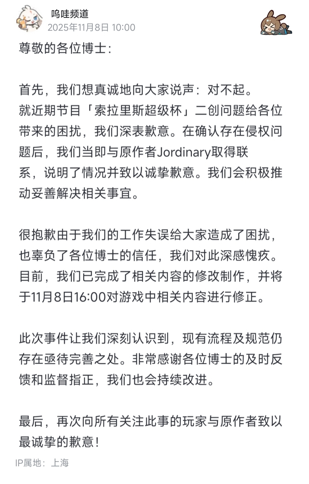 呜哇频道道歉了,用小号道歉真聪明😅