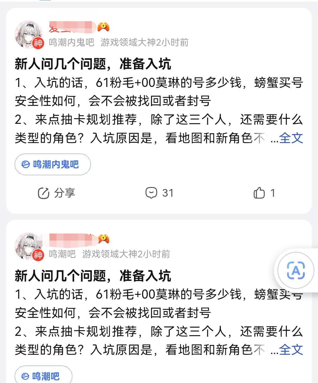 原神内鬼吧 崩鬼吧大大方方给鸣潮引流这块tid:104394280062026/01/28 22:50:04102103 8 0楼主:晒卡死个吗 真實之泪最后回复:亚当醬醬 东陵老中医💫2026/01/29 08:21:421楼pid:1531398060412026/01/28 22:50:04晒卡死个吗真實之泪 楼主 8级 难绷 看这位动态也没过激发言和节奏相关的,不赖 把萌萌人引流给鸣潮了2楼4条pid:1531398446122026/01/28 23:02:35额呃饿自己人啤酒牛奶橘子汁12级 崩铁✌真有钱毒舌天然呆Sama 白鳥律7级 回复 啤酒牛奶橘子汁 :我亲死你额呃饿自己人 啤酒牛奶橘子汁 层主 12级 回复 白鳥律 :驾照就考科目四9级 你不就是崩爷额呃饿自己人 啤酒牛奶橘子汁 层主 12级 回复 驾照就考科目四 :崩铁长草80天还不退的真是神人了,这游戏每42天看个剧情然后开始每十几天自动战斗深渊20分钟,太无聊了。3楼pid:1531398575272026/01/28 23:06:40wyclove173级 累了4楼pid:1531400377602026/01/29 00:06:12安二孤单小红神希露菲_9级 这是好事5楼pid:1531402540222026/01/29 01:38:06q7156792墨明月🌱11级 6楼pid:1531405888502026/01/29 07:38:29攻略中的鬼神11级 人之常情7楼pid:1531406687512026/01/29 08:21:42亚当醬醬东陵老中医💫8级 看的出来mc粉毛确实做得好
