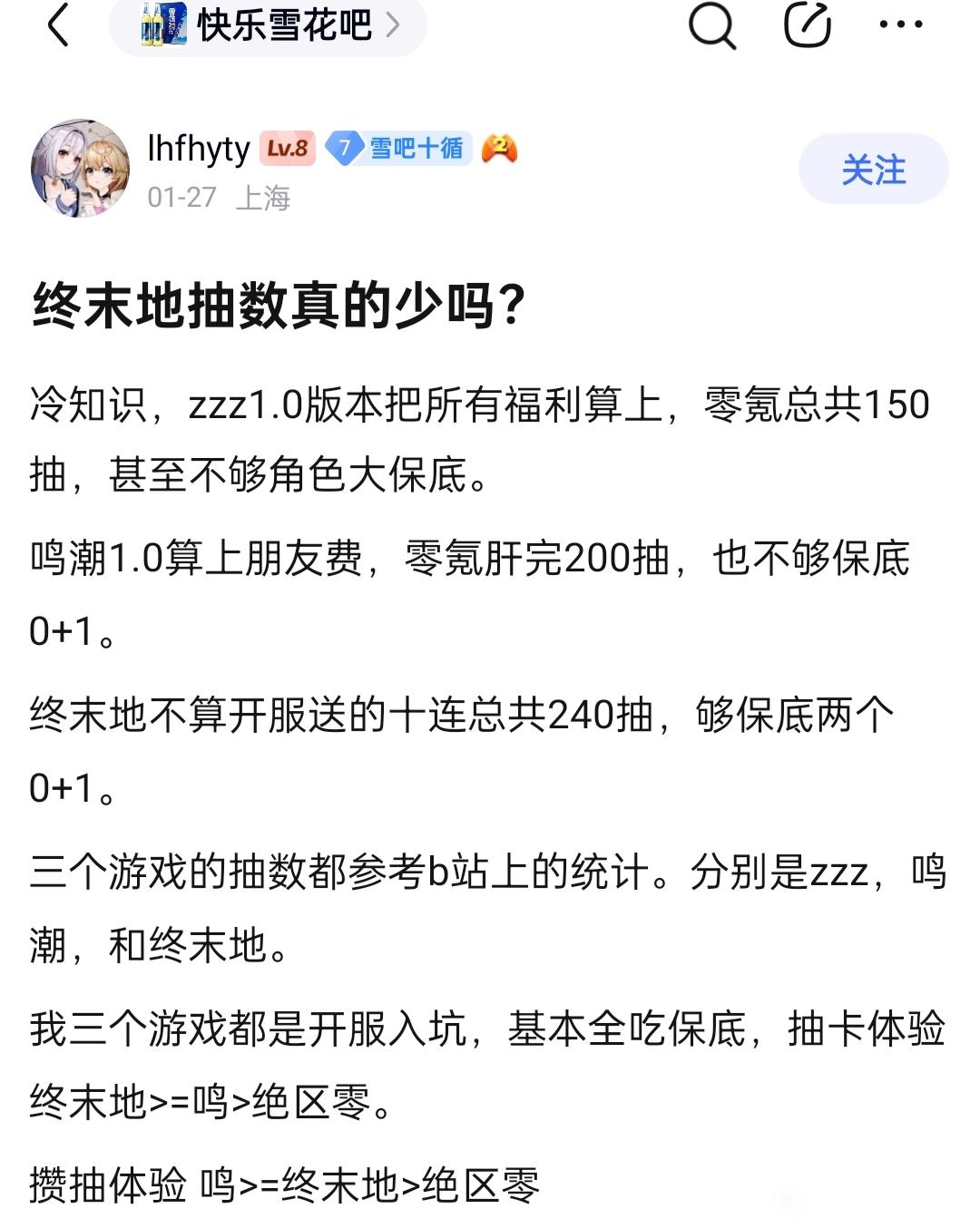 原神内鬼吧 终末地开服福利到底怎么样?tid:104418033462026/01/29 17:49:2811628 2 0楼主:慧聪宦官 xmxmxm1最后回复:X15940950196 X12187542026/01/30 17:25:151楼pid:1531423048752026/01/29 17:49:28慧聪宦官xmxmxm1 楼主 3级 为什么快雪公公总是认为终末地福利好呢?我们先姑且把能肝到的资源都叫福利,如图是这位公公给的数据,小绝总共150抽,wuwa200抽,终末地240抽。难道真是被友商黑稿 福瑞比福利多打压了?2楼pid:1531423604772026/01/29 18:08:36水电总局局长3级 一坨 肝的太难受,地图小巧思太多,比原神都要累,更不用说鸣潮了。四号谷地全部肝满,主线和基建任务全部拉满大概100多抽限定,常驻倒是很多也有100多抽wuw1683级 逆境出人才3楼pid:1531423672912026/01/29 18:11:05三月七今天吃啥四月七(快乐版)12级 洗地终末地福利的,家里四个🐴5楼pid:1531424537972026/01/29 18:41:05天空的弦歌1级 鸣潮的6楼pid:1531424615592026/01/29 18:43:47天空的弦歌1级 0氪,600天20万星声,200多限定抽,因为活动打不满,实际会更多7楼pid:1531424767302026/01/29 18:49:01黑檀木vs翠西天才社长雪莉露11级 快雪dinner彻底疯了他明日方舟就不是什么送福利的主非要吹他🦶叠福利干嘛8楼pid:1531425593052026/01/29 19:16:47李朋励套狗队金牌捕手张师傅9级 太监是这样的必须得忠心效忠主子9楼pid:1531425649032026/01/29 19:18:36游戏领域大香蕉哈基追11级 肝出来的叫福利那我很感谢让我996加班的老板了,快雪是那种加班都要感激磕头的人吗10楼pid:1531425918672026/01/29 19:27:16吃不消子打粥不如打牌1级 快雪那帮人是这样的11楼pid:1531459660772026/01/30 17:25:15魏国中求包养翔魔鬼7级 不是,哥们儿,福利也要被重新定义了吗12楼pid:1531459660922026/01/30 17:25:15X15940950196X12187548级 240?不是400吗?