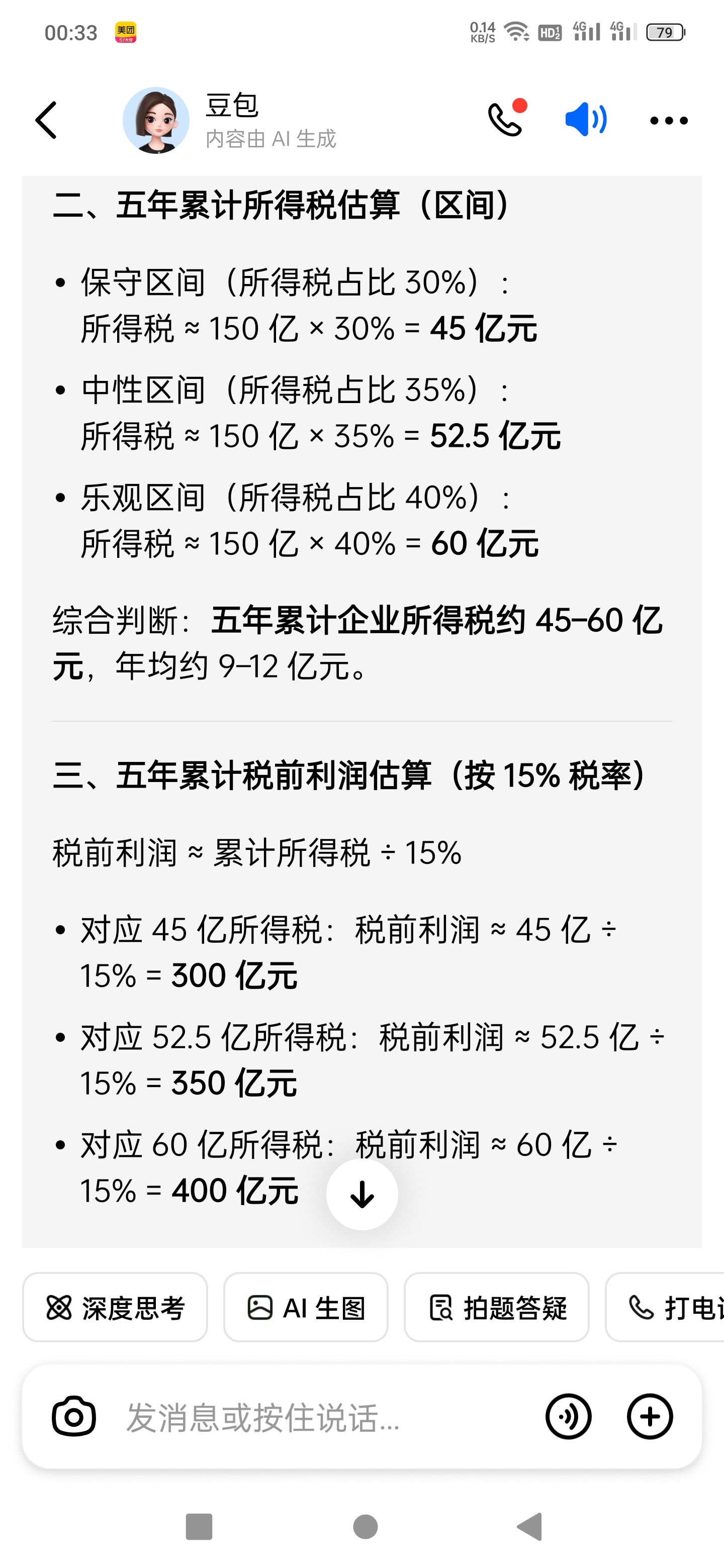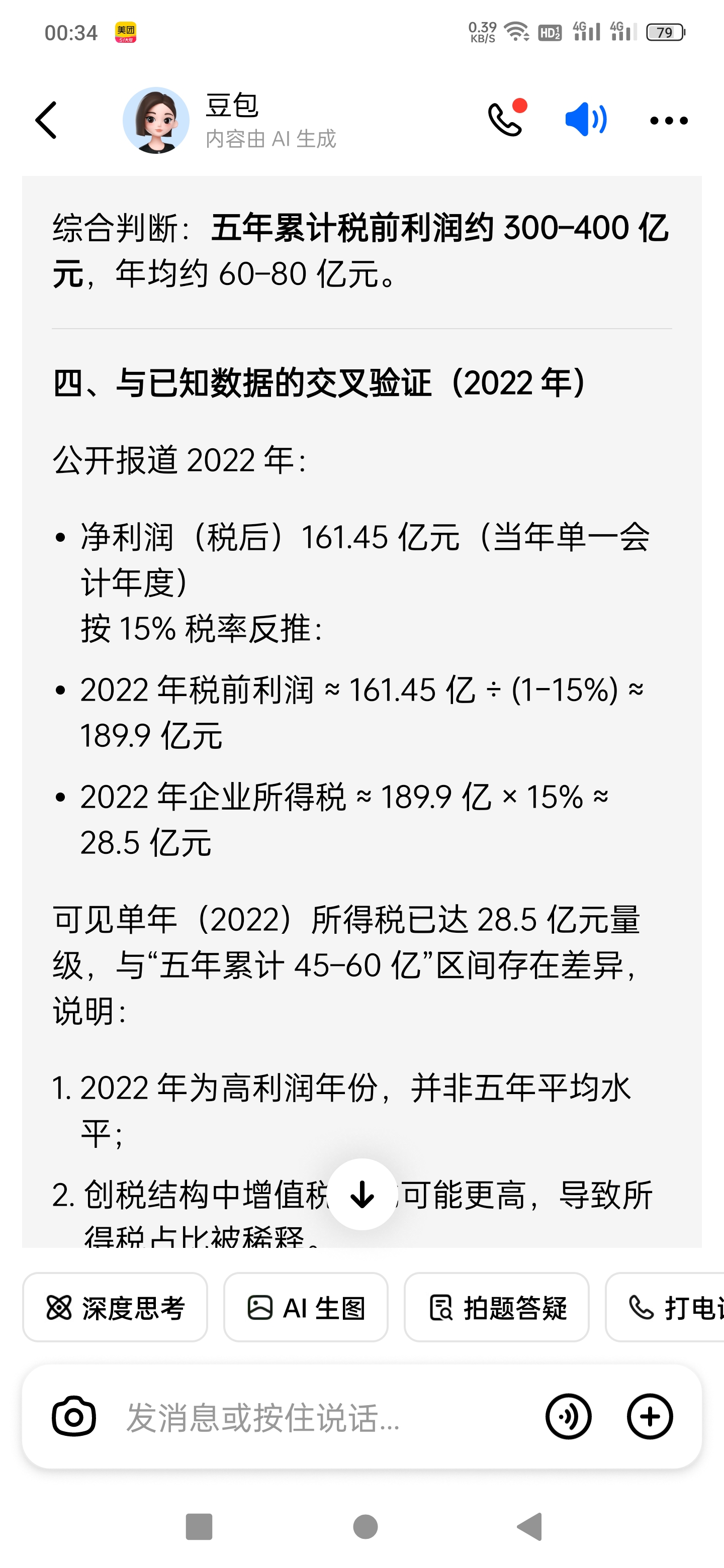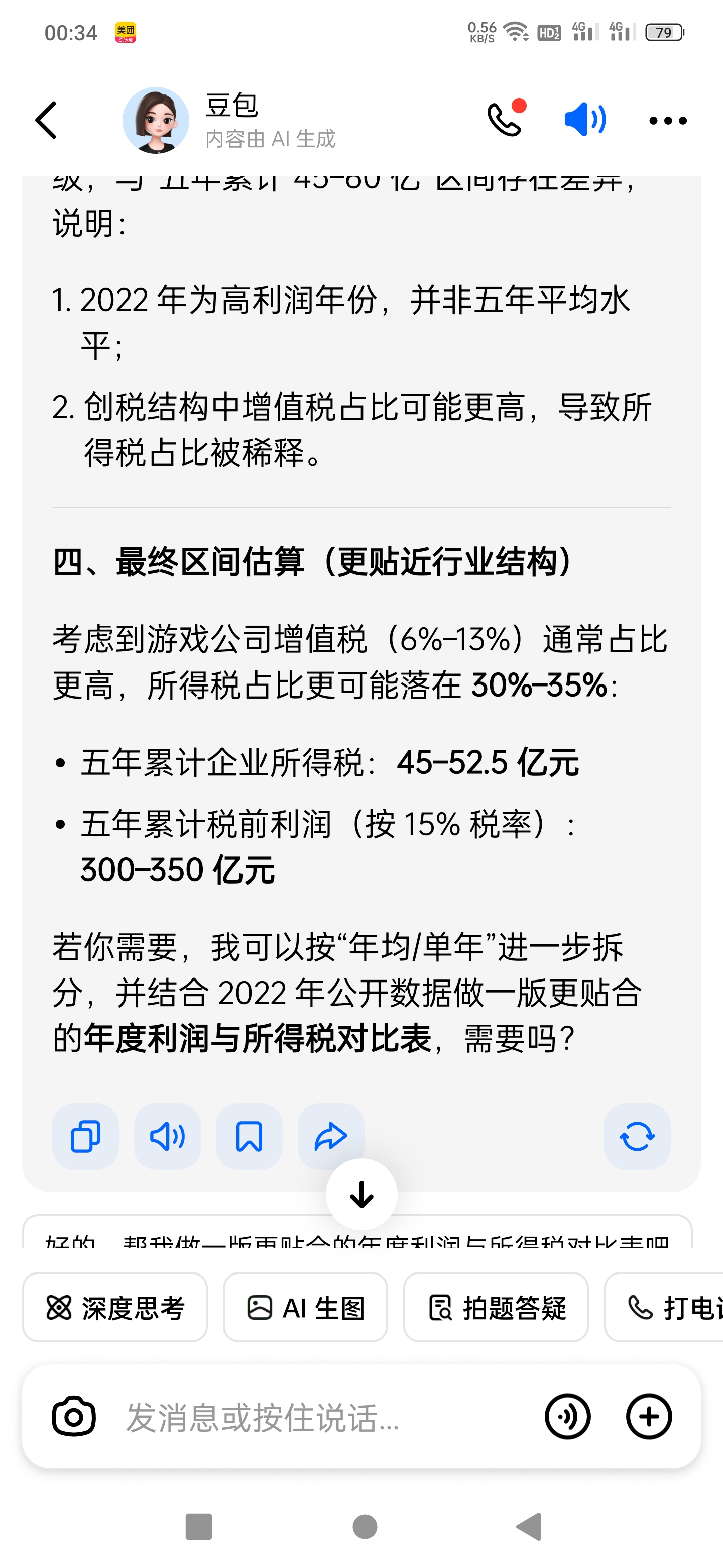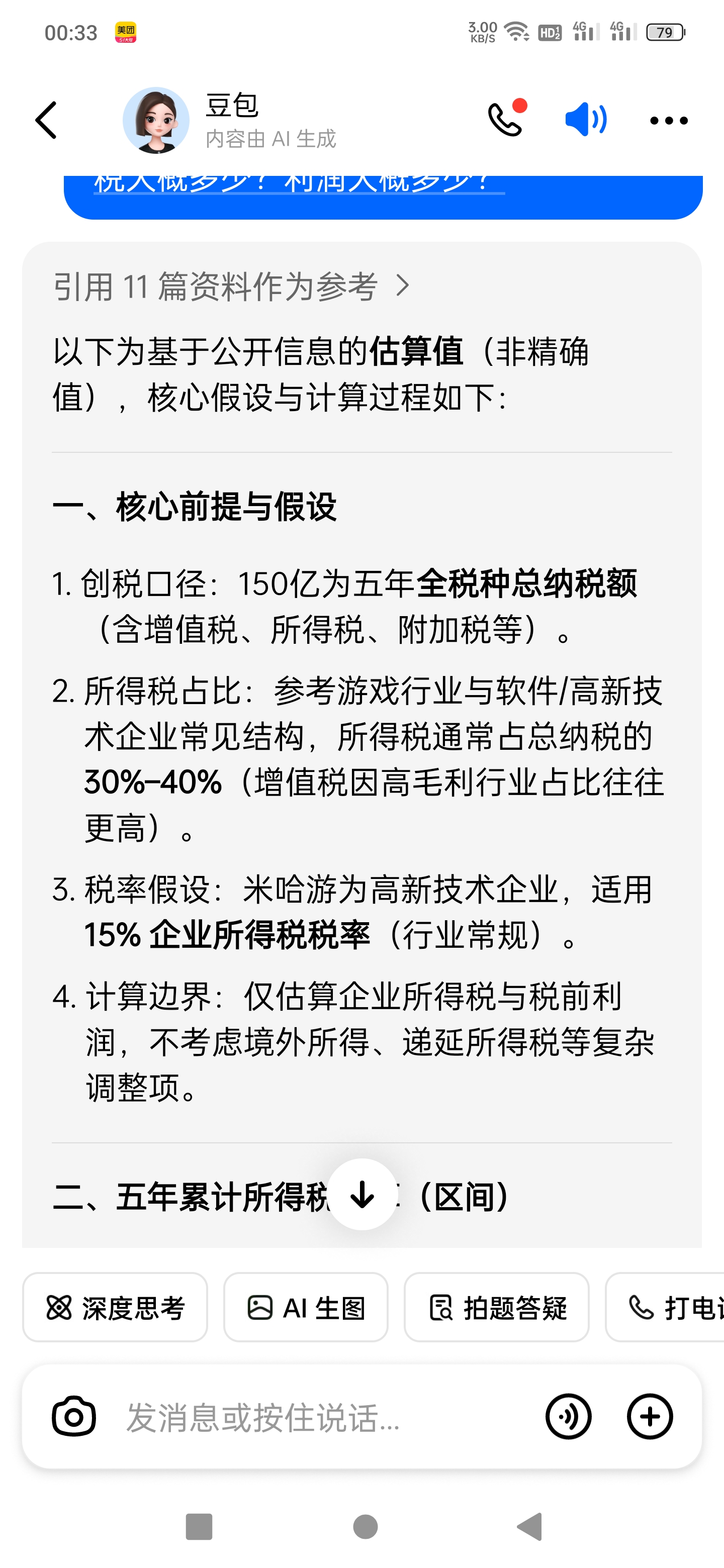 我的回复也一起删了,其实重说一次就是,豆包这个计算绝对不对。光明日报披露2022年米哈游营收273亿,净利润161亿。净利润就是税后利润。而豆包认为米五年税前利润350亿到400亿。扣除150亿缴税,只剩200亿到250亿净利润。也就是米除了2022年一年161亿之外,其他4年加一起就100亿。可能吗?