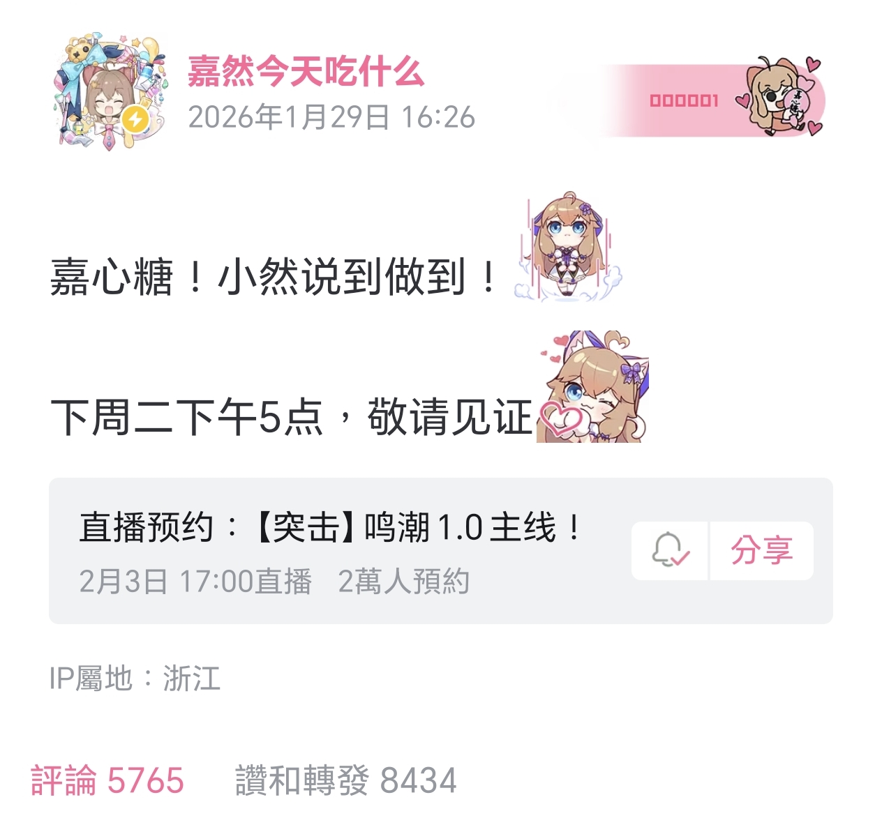 嘉然鸣潮预约突破2万,仅历时27小时......