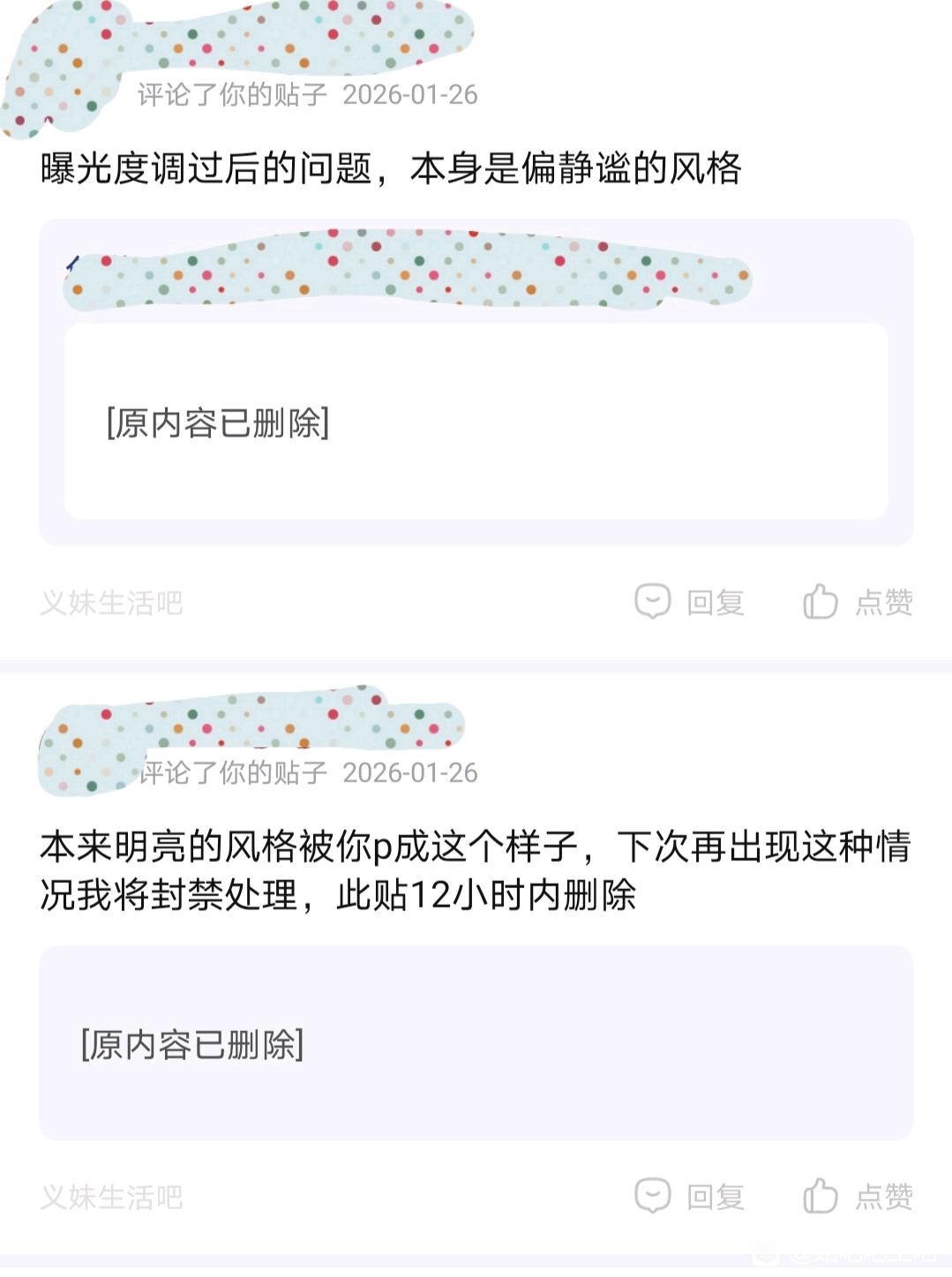 1楼pid:1531485835102026/01/31 12:22:13花婿花嫁 楼主 1级 ■第一张图片,左边是原图,右边是经过修改,不喜欢原图色彩那么淡就调整一下光线,结果收到吧内管事警告和删帖,第三张图片是他发过来的警告信息截图:下次再这么做就封禁处理,这次发的帖子12个小时内删除。在他的管理领域修改图片有这么“罪大恶么”?容不下这种行为!总之这种管理手腕很抽象!