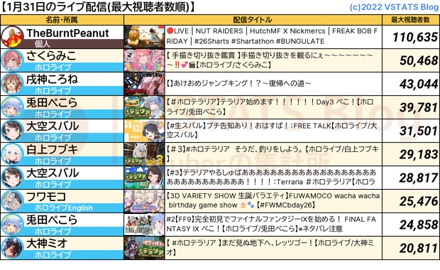 vtuber吧 2026.1.31tid:104485752592026/01/31 23:21:58121220 6 0楼主:泽塔kiss 莉·泽塔😺kiss小吧15级 最后回复:kuy8kuy82026/02/01 15:51:571楼pid:1531506707122026/01/31 23:21:58泽塔kiss莉·泽塔😺kiss 楼主 小吧15级 【1万以上枠数】27枠個人(TheBurntPeanut)ホロ16枠(さくらみこ, 戌神ころね, 兎田ぺこら, 大空スバル, 白上フブキ, 大空スバル, フワモコ, 兎田ぺこら, 大神ミオ, 大空スバル, 猫又おかゆ, 古石ビジュー, 白銀ノエル, 白銀ノエル, 綺々羅々ヴィヴィ, 一伊那尓栖)にじ9枠(叶, ローレン・イロアス, 夜見れな, 珠乃井ナナ, エクス・アルビオ, アンジュ・カトリーナ, フレン・E・ルスタリオ, 加賀美ハヤト, 叶)BraveGroup1枠(花芽すみれ)2楼1条pid:1531506872882026/01/31 23:27:08Sssakuramiko11级 狗子怎么一回来就玩jumpking琉琉糖球小吧12级 回复 Sssakuramiko :mikorone这一块3楼4条pid:1531511038642026/02/01 01:40:50kuy8kuy811级 这么看,泰拉瑞亚其实真不少人看啊?你甚至可以看到牢狐三才很久违得上到2w甚至3w。哪怕是错峰开台吃流量这也是个很不错的甜点了吧。Best_Leonzong11级 最近泰拉也更新到1.4.5了会飞的猫翅膀 Knight🐰9级 回复 kuy8kuy8 :主要是泰拉瑞亚最近大更新了,npc立绘都有了🥴Angle晓月1级 看她们玩泰拉瑞亚看的我头疼,明明6人中有3人是玩过的,整的像是6个初见。。。还有fbk一个僵尸手臂用10多个小时我是没想到的kuy8kuy8 层主 11级 回复 Angle晓月 :我因为没玩过,倒还好。。4楼pid:1531511520482026/02/01 02:05:25taonanyvci10级 牢孕一踩头吧里就冷清了5楼pid:1531513376302026/02/01 04:45:52俄锤4000加贴吧用户_JAKJXZN9级 直接给nijisanji挤出排行榜去了6楼pid:1531515319732026/02/01 08:06:47亻卷_日寸无伦º11级 癌细胞什么时候出来说再生数7楼pid:1531519913922026/02/01 11:02:52很对劲学计算机5级 清一色!8楼pid:1531520355292026/02/01 11:16:36突迪弛频指撕9级 @不知名遊客 是的,35只有.两w同接傍上没活人了