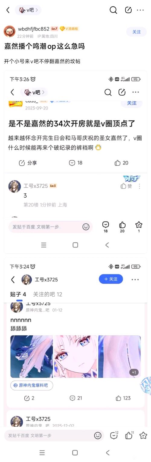 v吧 V8怎么有人开始挖坟贴上来😮tid:104504513112026/02/01 15:53:18181029 8 1楼主:慵懒的子淮同学 普斓最后回复:什么饭可惜2026/02/02 07:00:041楼pid:1531529973662026/02/01 15:53:18慵懒的子淮同学普斓 楼主 11级 明明按照最新回复时间看帖,一看发帖时间都是1-2年前的呢😮2楼1条pid:1531530016822026/02/01 15:54:27fdfg230M1L1312级 op进攻了慵懒的子淮同学 普斓 楼主 11级 爆了!3楼1条pid:1531530070752026/02/01 15:56:01拆你死狐狸王超越究极的究极红马尾1级 op团建了慵懒的子淮同学 普斓 楼主 11级 😱😱4楼1条pid:1531530177362026/02/01 15:59:10◆沙子◆12级 别的地方看到的慵懒的子淮同学 普斓 楼主 11级 对,就是这个叫工号的在挖5楼3条pid:1531530260372026/02/01 16:01:33wbdhfjfbc85210级 有个op在翻嘉然的坟贴慵懒的子淮同学 普斓 楼主 11级 收到,谢谢小伙伴!wbdhfjfbc852 层主 10级 回复 普斓 :我a吧务了,没看到新的坟帖了,冰子应该封了慵懒的子淮同学 普斓 楼主 11级 回复 wbdhfjfbc852 :6楼pid:1531531220702026/02/01 16:28:52镜中映香花Aeiiv12级 看到咸鱼星23年的贴被挖了7楼pid:1531534273252026/02/01 17:55:42烟花巷陌g水之魔导莫娜11级 op真的低能8楼2条pid:1531534446202026/02/01 18:00:40哈登427336利益大王10级 曾经令人叹为观止的34次,在26年来看好像也不算什么大事贴吧用户_GZMQ1U28级 都是造谣,小心给你抓进去热忱🐑🐑7级 回复 贴吧用户_GZMQ1U2 :真造谣吗9楼pid:1531538059682026/02/01 19:49:25易歌魂6级 这也有奶龙啊10楼pid:1531542499622026/02/01 22:06:18万事屋新明玲ガチ13级 乃琳毕竟只是背靠asoul这个企划,嘉然是真的是曾经万象天引的国一v、b站唯一的2万舰,op看到嘉然播鸣潮要急死了11楼pid:1531552684852026/02/02 07:00:04什么饭可惜8级 op急了