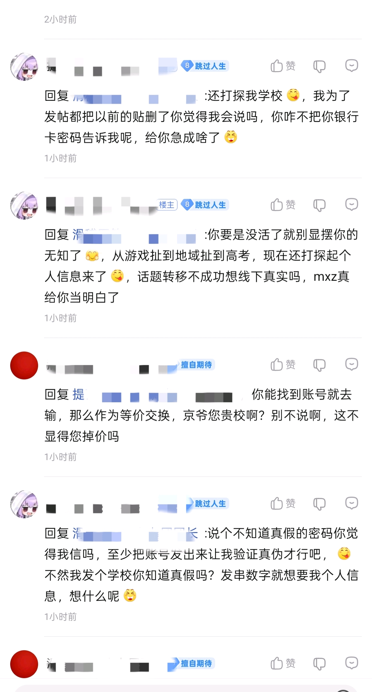 ,我只要让路过的人认为你被怼到想跟人互爆个人信息的地步就行了,真假还重要吗,至少对线我没漏任何信息不论真假