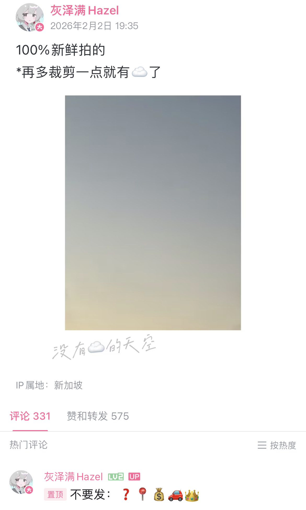 2楼pid:1531580739302026/02/02 21:55:05Sechsau 楼主 7级 首先是意义不明的照片:满区昨天在电台承诺会拍一张三次元照片,没想到发了这么一坨玩意儿,就这么害怕黑冻的三角定位吗,拍天空连☁️都不敢露😃但如果你只想到这儿,那只能说你根本不懂灰女妖的功力🤫注意配图文字:再多裁剪一点就有云了😥为什么要强调这一句呢😱灰女妖可谓是心机满满,我已经想象到一只灰色老鼠躲在屏幕后面看着黑冻想特定却特定不到的丑态而发笑的丑陋嘴脸了🤭