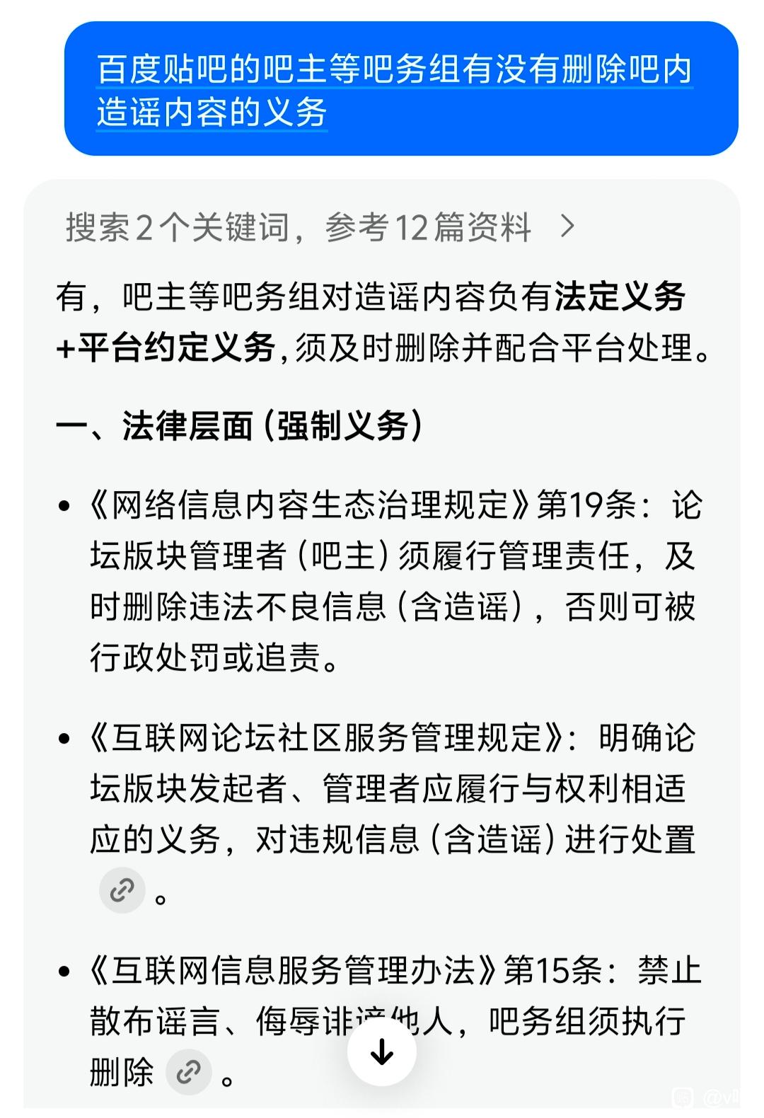起始页v吧 第二次三问v8吧主tid:104592348742026/02/04 12:34:42211427 13 0楼主:只骂弱智最后回复:花無十日紅丶2026/02/05 13:44:441楼pid:1531636867762026/02/04 12:34:42只骂弱智 楼主 7级 谁告诉你吧务组不用删造谣内容了?法律规定你是要漠视吗?平台约定你是要践踏吗?2楼1条pid:1531638777192026/02/04 13:37:02are_u_4e31级 ai是你爹吗我想问了Ak悠穹7级 肯定啊,他们是as这是ai,祖宗辈的,祖宗的话不能不听3楼pid:1531638887052026/02/04 13:40:26dusika_akankandioneni10级 好急4楼pid:1531639061522026/02/04 13:45:53潇洒地从者7级 看直播就看直播,想想自己家人,别当孝子5楼pid:1531639666682026/02/04 14:05:37英宗金牛12级 🧊你听着!6楼pid:1531639688902026/02/04 14:06:23qwerty14973石田光🍎13级 别太爱了7楼pid:1531639734442026/02/04 14:07:54流星光底逸长🐍1级 炮打🧊醋8楼pid:1531639869982026/02/04 14:12:31用户_GXZMVU小吧11级 贴吧这一块造谣也不少了,你觉得封禁不够严,还有人觉得v吧管太多不够开放呢10楼pid:1531641795112026/02/04 15:12:32秦好多个还是鹏昔我往矣🌿🌿11级 像刚出壳的🐢崽儿,毛还没掉11楼pid:1531641895132026/02/04 15:15:34不污的妖王ajdh12级 真有点魔怔了哥12楼pid:1531643125732026/02/04 15:53:22莫仁人11级 还能说话吗13楼1条pid:1531643294302026/02/04 15:58:36gshenshi荔枝味夏10级 不要问AI法律问题,它自己会虚构法律词条会自己编的gshenshi 荔枝味夏 层主 10级 比如你问AI举例那个第十五条就是假的,和真的不符。你真信AI也是没救了14楼pid:1531643844742026/02/04 16:15:43深东慧敏1级 呃呃,有点分辨不出了15楼pid:1531644026862026/02/04 16:21:12只骂弱智 楼主 7级 @荔枝味夏 有没有可能我可以点进AI的参考网页里面看真假16楼pid:1531646947862026/02/04 17:48:29紫易王朝12级 冰子改了吧规,全体v87一致通过了17楼pid:1531647456662026/02/04 18:04:15skksjjaskddd有🎹有🎹11级 太正直就不要玩贴吧了,当然光上网就够你累的了18楼pid:1531647566522026/02/04 18:07:37自然♀灾害客观辩证的愣🌞11级 这么大的事我建议给冰子发律师函19楼pid:1531647617882026/02/04 18:09:10救赎1008611级 🧊子说话20楼pid:1531647768072026/02/04 18:13:55弱音家的老公公爵分配凌一夫人12级 急了,你要是真这恨,你也可以这样攻击他主子阿梓21楼pid:1531650354422026/02/04 19:37:47长安夜话绊爱版9级 你们说的这些,都是鸡蛋里挑骨头,挑来挑去……22楼pid:1531671468562026/02/05 11:22:01OpoemJamXctwar⚡14级 把ai图去了再发一遍23楼pid:1531676225802026/02/05 13:44:44花無十日紅丶10级 叽里咕噜的说什么呢 给我去小黑屋待2个月