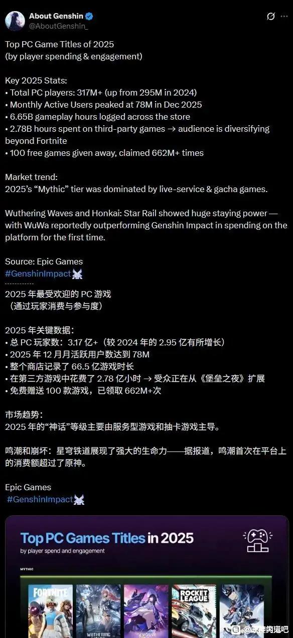 epic评选2025年神话级游戏总计五款游戏上榜,其中鸣潮上榜