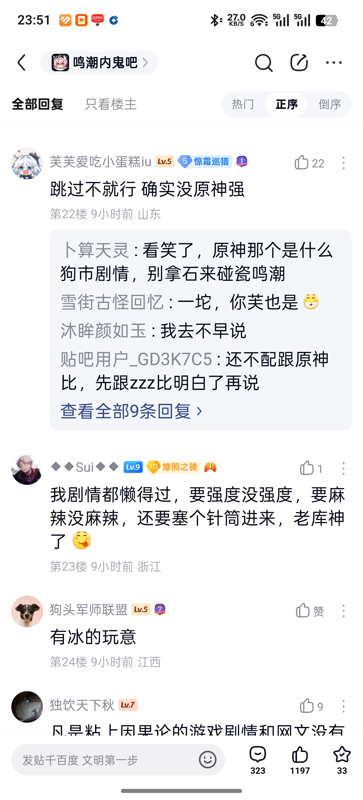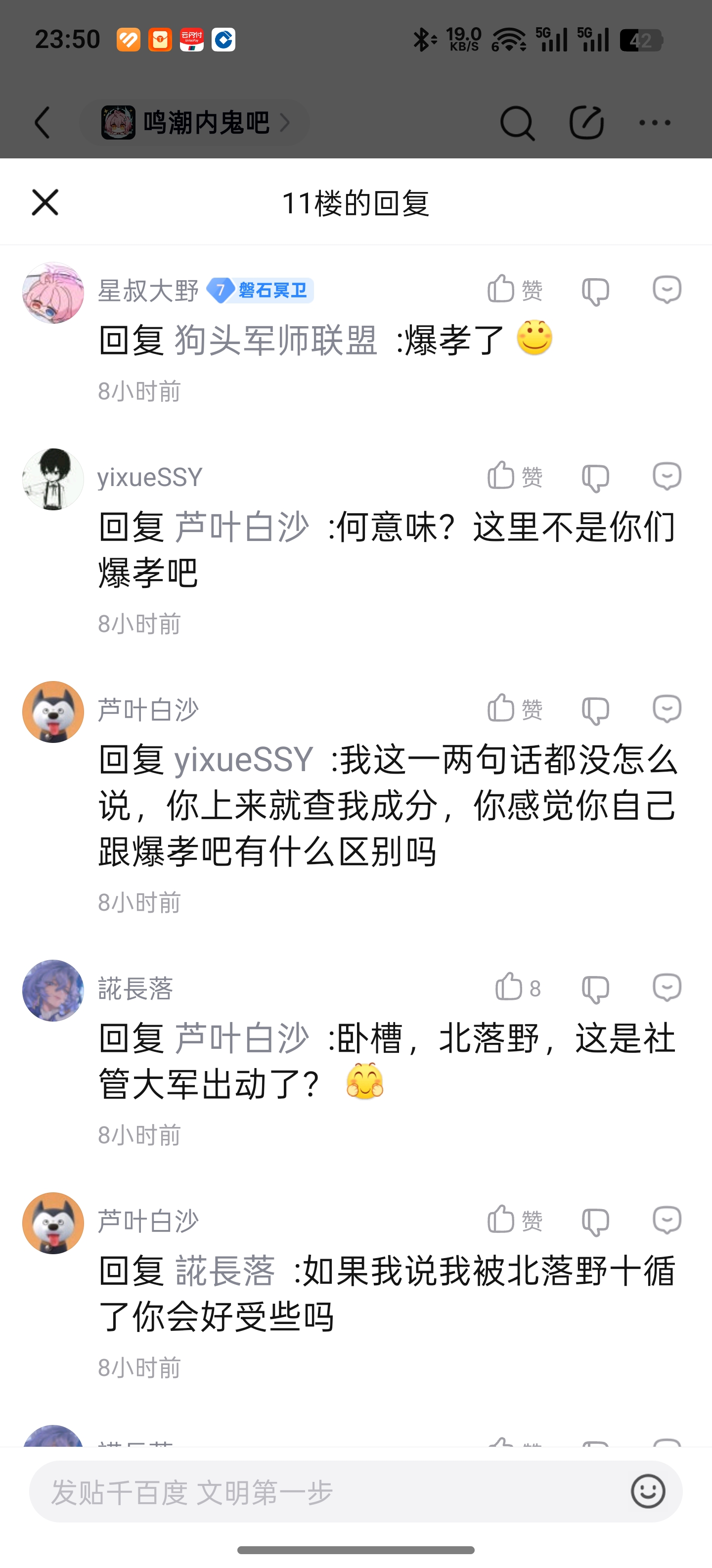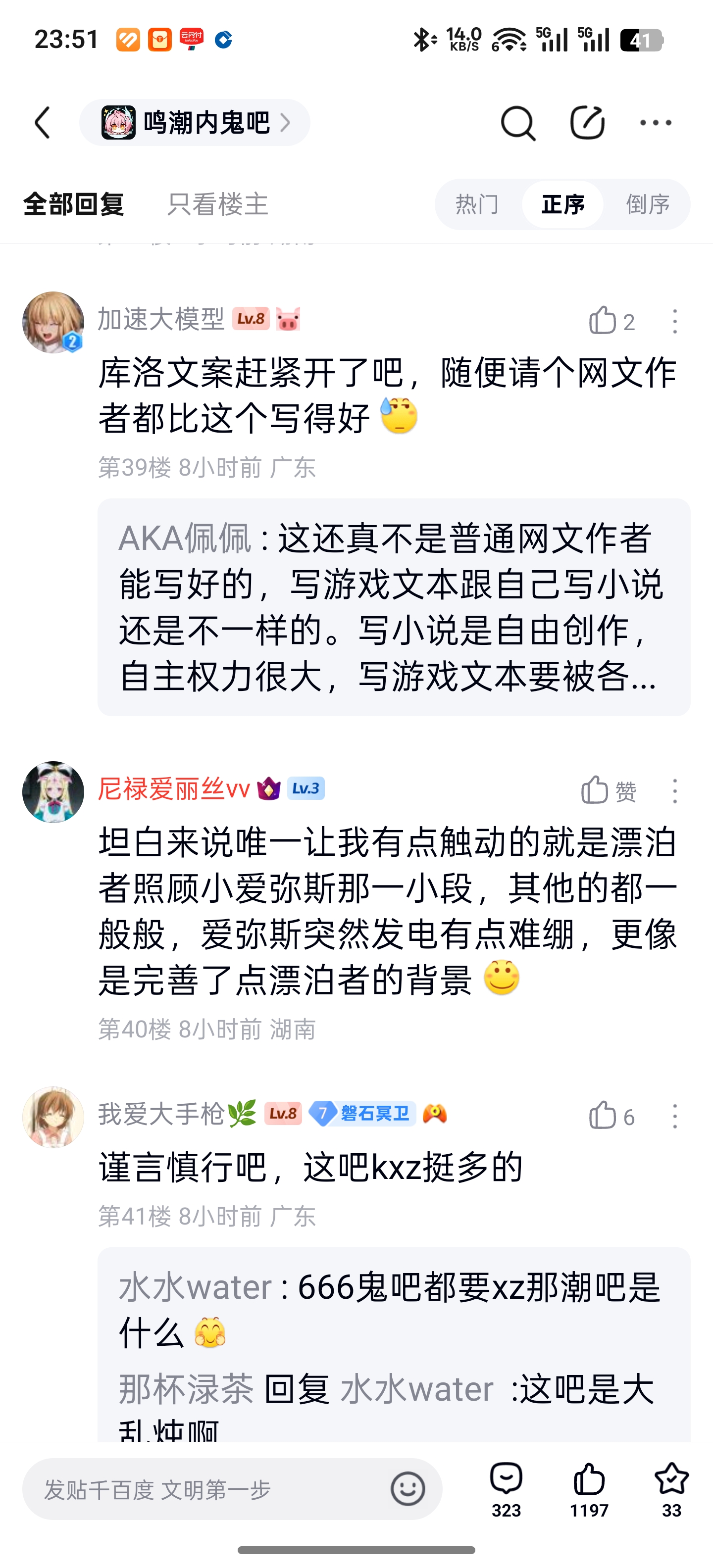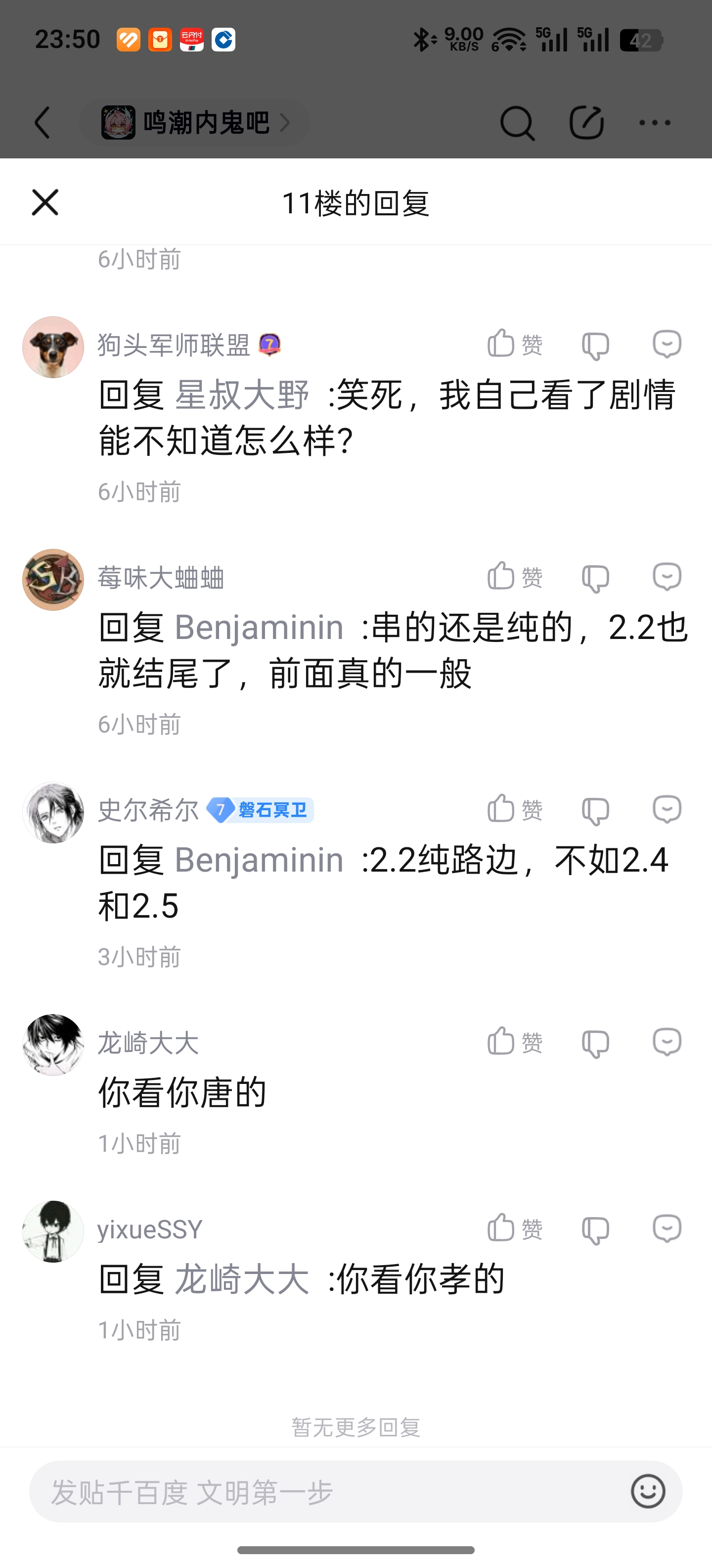 4楼1条pid:1531697902572026/02/06 00:58:35逐梦457✨逐梦✨11级 鸣潮内鬼、新鸣内鬼这两个吧的人和一般mxz的区别就是前者玩鸣潮后者不玩,骨子里还是向着米,但米桑拿不出那个质量,只能玩鸣潮,一边玩一边阴阳,以此巩固脑机接口,免得被夺舍。我说木有9级 不好意思,新鸣也有很多不玩的,比如那个不是坎特累拉厨就是盗图装氪佬的
