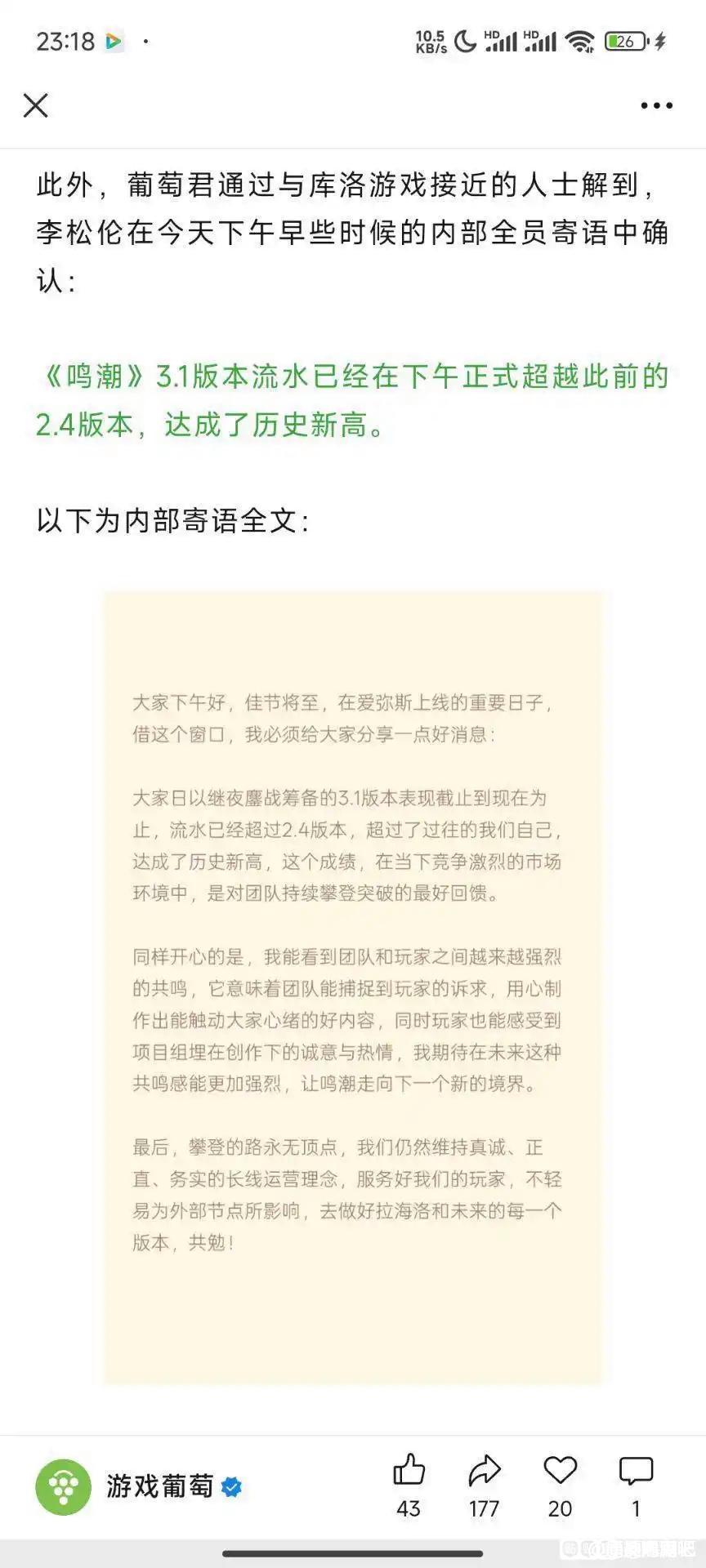 贴吧用户_Jt6at18鸣潮买量再创历史新新新新新高,鸣潮玩家数量暴涨但3.0开服流水反降?,3.1累充➕礼包被卡提腐乳,但是库洛又赢了,kg又赢了,myg又输了。至于输在哪儿,咱也不知道啊。