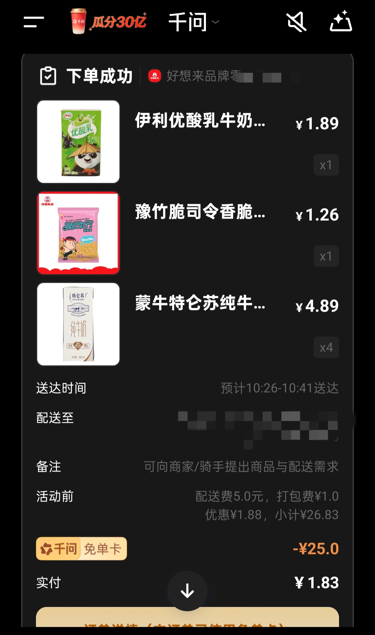 1楼pid:1531743892302026/02/07 10:31:35DK梦醒好可怜的花火 楼主 13级 网页链接这波真给我薅爽了!表面是送奶茶其实可以去超市白嫖25的商品。 千问最近搞送奶茶活动。我发现送的25元无门槛可以用到美团闪购上,就是在给出的商家左右划找淘宝闪购,进店后再把预选的奶茶取消后就可以随意选商品了。我已经白嫖了几百块的牛奶可乐等零食了。 元宝我从第二天就薅不到了,不知道这个能薅多久,吧友要搞尽快吧。(保证不骗人,就是现在爆单了平台开始要配送费,图片上午刚点的)