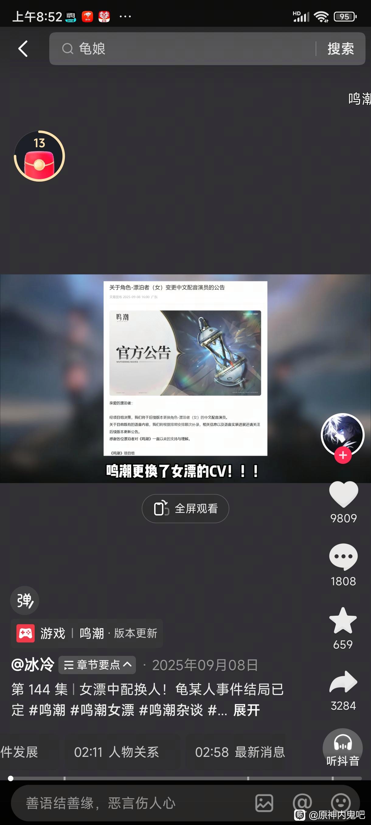 2月7号,二游鸣潮最高观看人数13.3万龟娘跟库洛没了,就跟爱弥斯只剩饺子皮,你可以在网上找到龟娘声音视频就没了,龟娘不换,这次节奏少不了