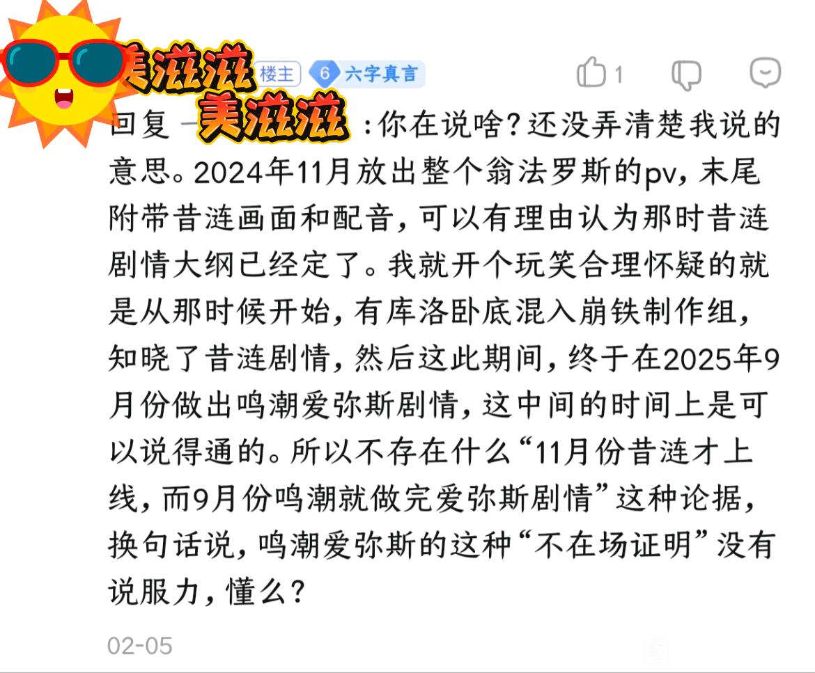 4楼1条pid:1531782156272026/02/08 12:04:04膧暝1级 米哈游文案拿头跟库洛比,战双也就太小众没多少人知道罢了,鸣潮把战双演出这块弥补了会慢慢展示出库洛文案的实力,3.1才刚开始等着吧,一大堆伏笔还没回收呢啦啦啦啦啦BBQ 渣女何欢7级 中二漫看多了吧