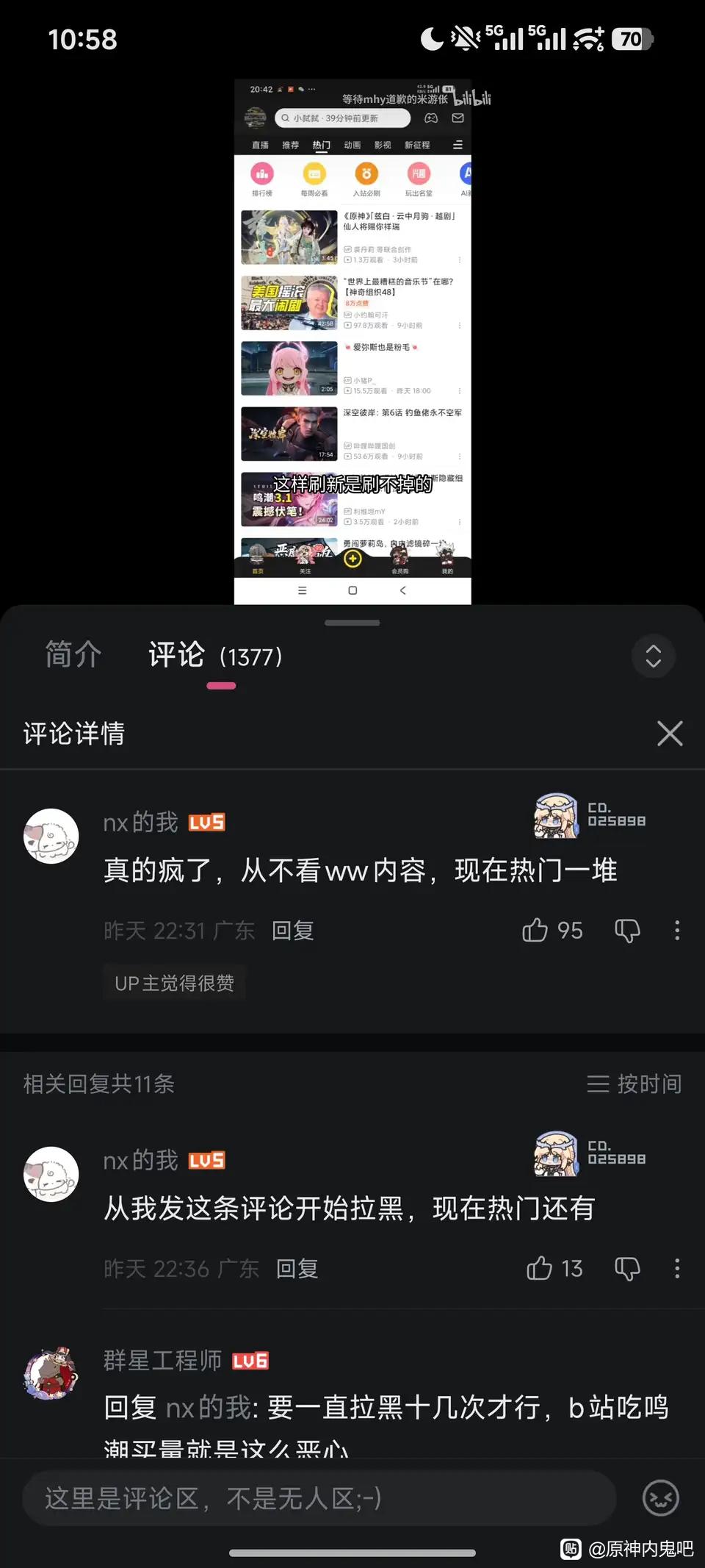 原神内鬼吧 笑点解析。tid:104772899142026/02/10 18:42:04142016 53 0楼主:白九九默默最后回复:zmlxrikki贴吧用户_aX84t7M2026/02/11 12:44:481楼pid:1531867082082026/02/10 18:42:04白九九默默 楼主 8级 2楼pid:1531867147332026/02/10 18:44:19QuantumQuark海蛎波特7级 说明他没少搜鸣潮内容...都2026年了,还不知道B站热门是根据观看推荐的吗?3楼1条pid:1531867159142026/02/10 18:44:42顽皮方齐宇琪亚娜爱穿兔女郎跳舞2级 这种野狗就是社区中的边牧艾米绿亚10级 泰迪,看见母角色就哦齁齁齁,拔出来了就开始叫4楼pid:1531867419902026/02/10 18:53:36迁九配七七9级 估计没少用这个装饰反串,等着myg开团自己5楼pid:1531867607442026/02/10 19:00:02a918608090a理塘没有dj8级 这种yg最爱在社区里撒泼打滚了,等着被人骂自己收小红点6楼pid:1531867854472026/02/10 19:08:37王者之剑圣域8级 他不知道这个热门是根据自己搜索词条的吗我几年没点米桑相关的词条现在都没有米桑相关只有些单机相关了8楼1条pid:1531868703652026/02/10 19:36:00又9527TES.Zeus10级 笑点解析,鸣潮装扮,一遍用着鸣潮装扮一遍拉黑鸣潮相关,大数据人傻了:难道他有双重人格?fu55301级 日常传送到mc评论区恶心人被大数据记住了呗9楼pid:1531871532452026/02/10 21:00:42贴吧用户_G99a7W51级 我有个b站号专门点二游不推荐的,因为二游一刷就推很多,点了不推荐后其实刷到的会很少的,但有时候还是会因为其他的tag标签推送到,但绝对很少。点了不推荐后,就算你再点二游一些视频,也给你推的少。不信自己去试试10楼1条pid:1531874349092026/02/10 22:21:36玥璃2331级 只有我知道要免费拿这个装扮得给鸣潮主播点赞关注做日活吗?茶颜茶语°9级 不是9.9包邮?11楼1条pid:1531887064172026/02/11 09:42:41愿热爱终抵群星冰清玉洁莫宁7级 那你干嘛要抽装饰🤣🤣🤣怨仇灬1级 之前活动有白嫖的,看视频分享就行13楼pid:1531892752892026/02/11 12:44:48zmlxrikki虾翼尾9级 这种就是喜欢看黑鸣潮的视频然后把自己主页刷成了鸣潮的样子又在叫为什么给我推鸣潮