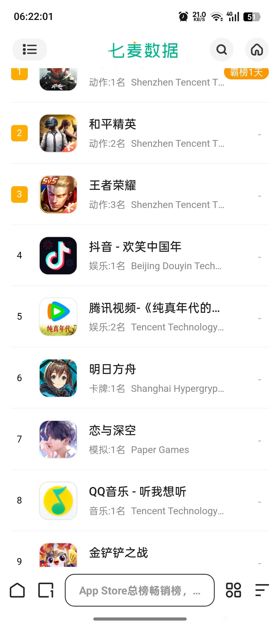 因为春节是最强榜单 腾讯视频也会变强 七麦本来就是热度收入综合榜单 应用春节都是高峰期,学小绝偷一年最弱的榜单才有机会上去