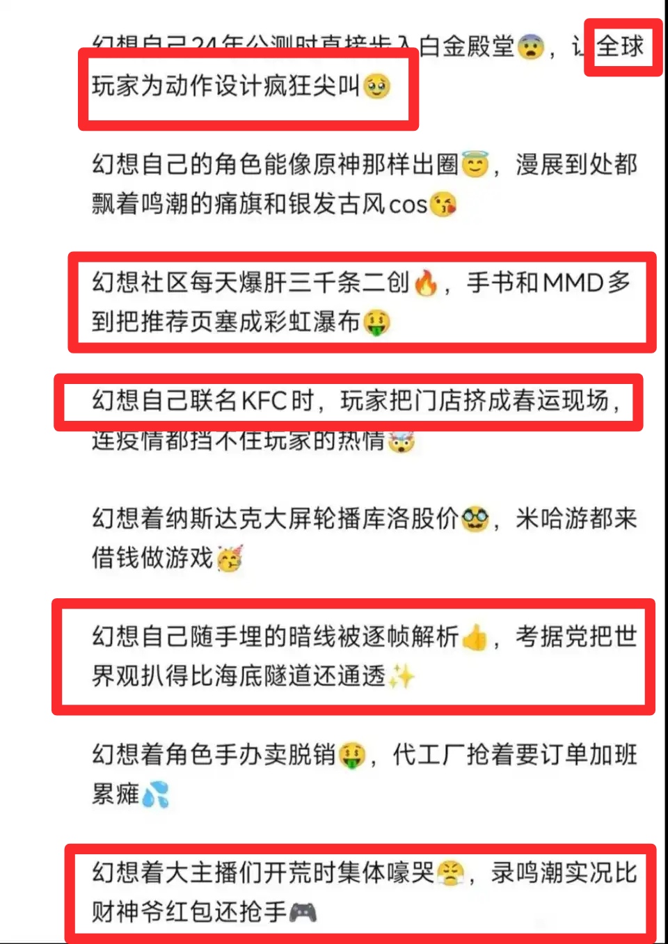 第五条指的是流水下降24%吗 第六条指的是剧情全是爱你,抽卡页面跳脸,特效阉割冲2000块的🐔吗 第七条指的是下架延期又延期的阮梅手办吗 第八条指的是自家kol看3.7大粪剧情都插着脑机接口如丧考妣痛哭流涕的专业表演吗