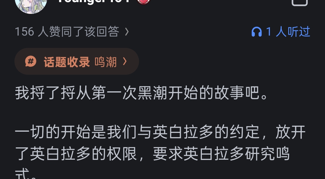 Youngest_46回复:知乎的鸣潮问题,写回答的话,内容完全是鸣潮的话其实没什么米u团建的,当然也没什么人关注,不过偶尔还会有一两个,我这篇回答下除了潮友的指正和夸的评论,就是米u的“剧情很好,但是。。。”这类评论,相对而言知乎人太少了,不如b站那么抽象和嘴硬,有个米u写了篇回答阴阳2.2,但在我这篇回答下面评论是“故事挺好的”。我的看法是知乎是活在信息茧房了,不肯承认鸣潮现在真的很好。